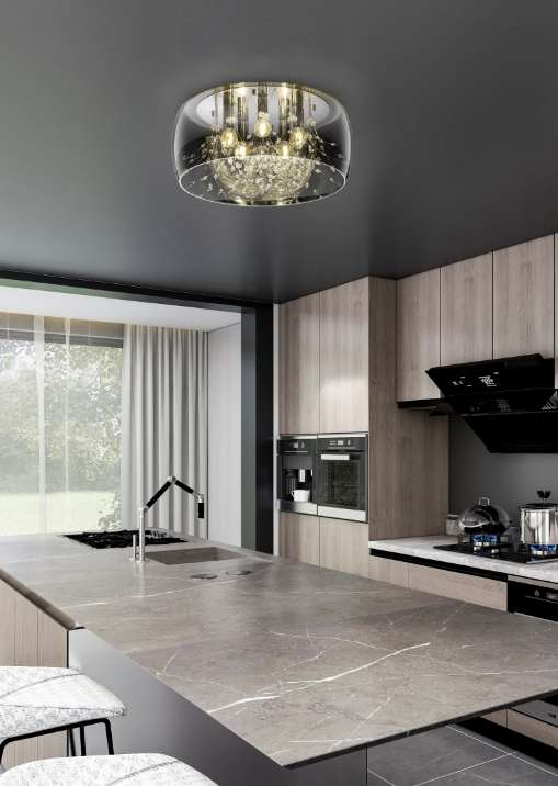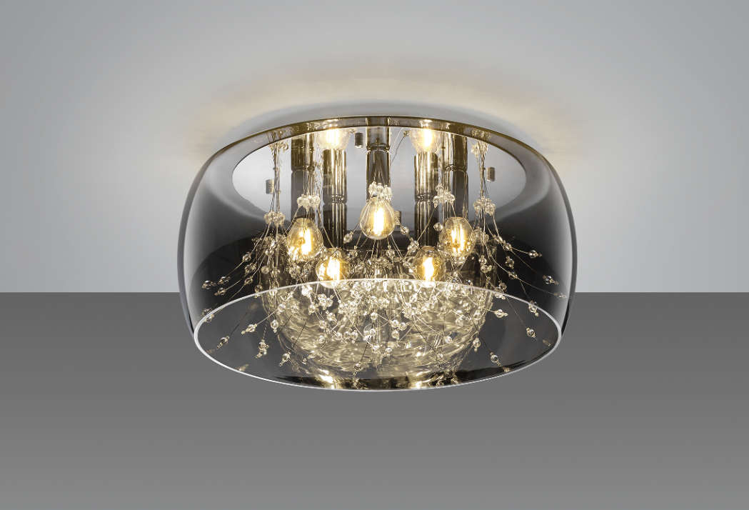 Een elegante plafondlamp uit de serie Crystel van het merk Trio. Deze moderene plafondlamp kan goed worden toegepast in verschillende binnenruimtes, zoals bijvoorbeeld in de slaapkamer, woonkamer of hal. Dankzij het verchroomde glas brengt deze lamp sfeer aan het interieur. De binnenkant van de lamp biedt plaats aan 28 glazen decoratiehangers. Wanneer de lamp niet brand blijft de plafondlamp een echt blikvanger. De lamp wordt exclusief lichtbronnen geleverd. De plafondlamp biedt plaats aan vijf E14-fittingen die geschikt zijn voor een max. wattage van 28W.