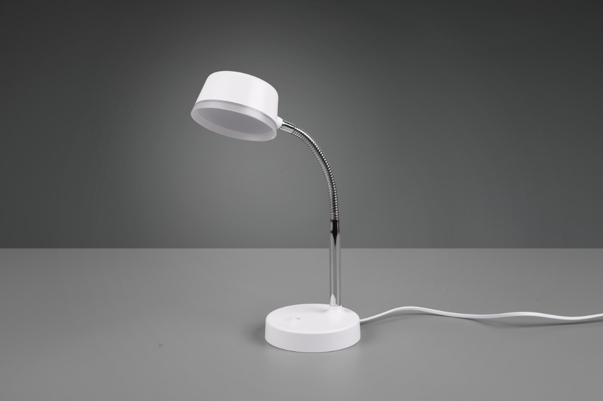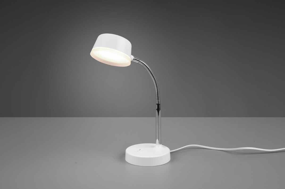 Een budgetvriendelijke bureaulamp van het merk Trio welke gemaakt is van kunststof en uitgevoerd is in de kleur wit. Deze moderne lamp heeft een flexibele aanpasbare arm waardoor deze gemakkelijk in functioneel licht kan voorzien. Dit maakt hem onmisbaar op het bureau in de woon- of werkkamer. Dit tafellampje wordt inclusief lichtbron geleverd, te weten een geïntegreerde SMD-LED lamp met een wattage van 4,5W. De lichtopbrengst van het warm witte licht (3000K) bedraagt 300 lumen. De aan- en uitschakelaar op de armatuur zorgt voor veel gemak. Dit voorkomt het zoeken naar de schakelaar langs het 170cm lange snoer.