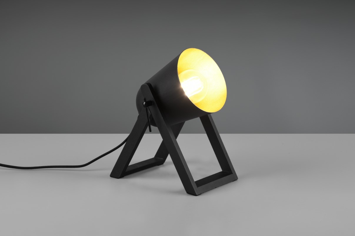 Een bijzonder leuk tafellampje van het Duitse verlichtingsmerk Trio. Door de combinatie van het metalen kapje met het onderstel van natuurlijk materiaal (hout) past dit lampje in tal van interieurstijlen. Het metalen kapje heeft een diameter van 12 cm en is uitgevoerd in de kleuren zwart en goud. Het kapje biedt plaats aan één E27-fitting die geschikt is voor een max. wattage van 25W welke niet is inbegrepen, maar die afzonderlijk bijbesteld kan worden. Wij adviseren een energiezuinige LED lichtbron. Zelfs als het lampje uitstaat is het een stijlvol accessoire dat de aandacht trekt. Plaats het op een kast of bijzettafel met bijvoorbeeld een klein plantje ernaast. Het anderhalve meter lange strijkijzersnoer beschikt over een schakelaar. Dankzij de stelschroeven aan de zijkant kan de lichtbundel in de gewenste richting worden gericht.
