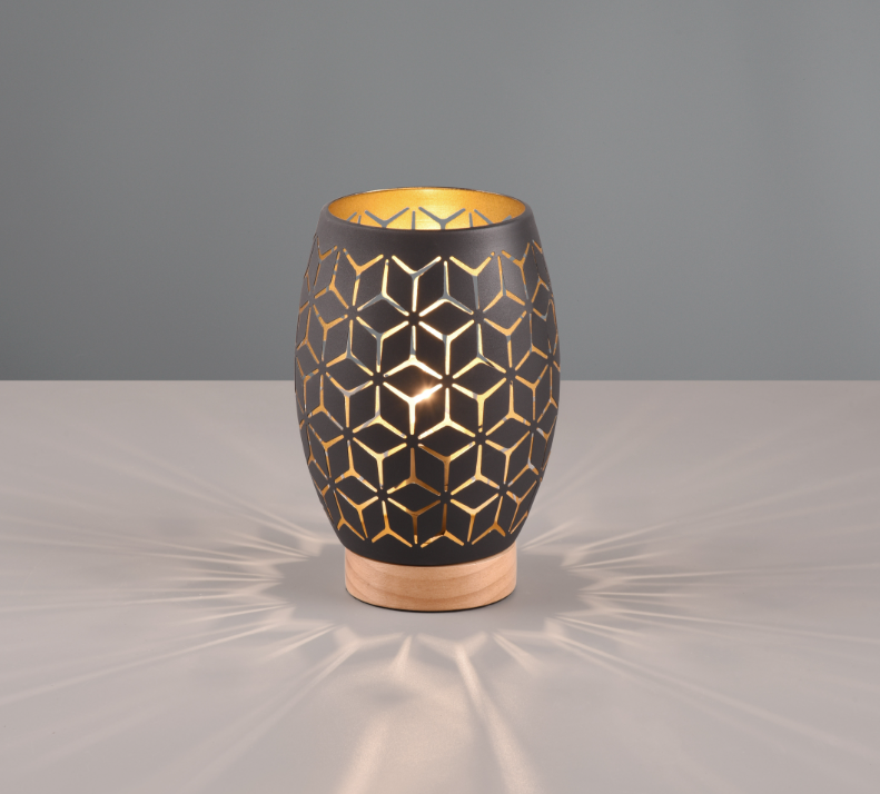 Een tafellamp van het Duitse verlichtingsmerk Trio. De lamp is gemaakt van metaal en heeft een mooie zwart-gouden kleur met een hout element aan de onderkant. Er kan één lichtbron met fittingmaat E27 in geplaatst worden van max. 28W (exclusief). De tafellamp kan goed worden geplaatst in verschillende ruimtes zoals woonkamer en slaapkamer, bijvoorbeeld op een bijzettafeltje of als nachtlampje. Door het motief in de kap geeft deze lamp een leuke lichtspreiding. Tevens heeft de lamp een handige snoerschakelaar.