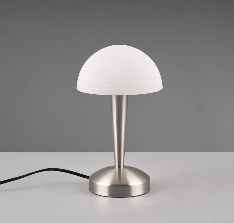 Een tafellamp van het Duitse verlichtingsmerk Trio met een klassieke look. De lamp is gemaakt van metaal en glas en heeft een nikkel-matte kleur met een wit-geborstelde kap. De LED lichtbron heeft een wattage van 4,9W (inclusief). De tafellamp kan goed worden geplaatst in verschillende ruimtes zoals woonkamer en slaapkamer, bijvoorbeeld op een bijzettafeltje of als nachtlampje. Het armatuur kan door aanraking worden in of uitgeschakeld.