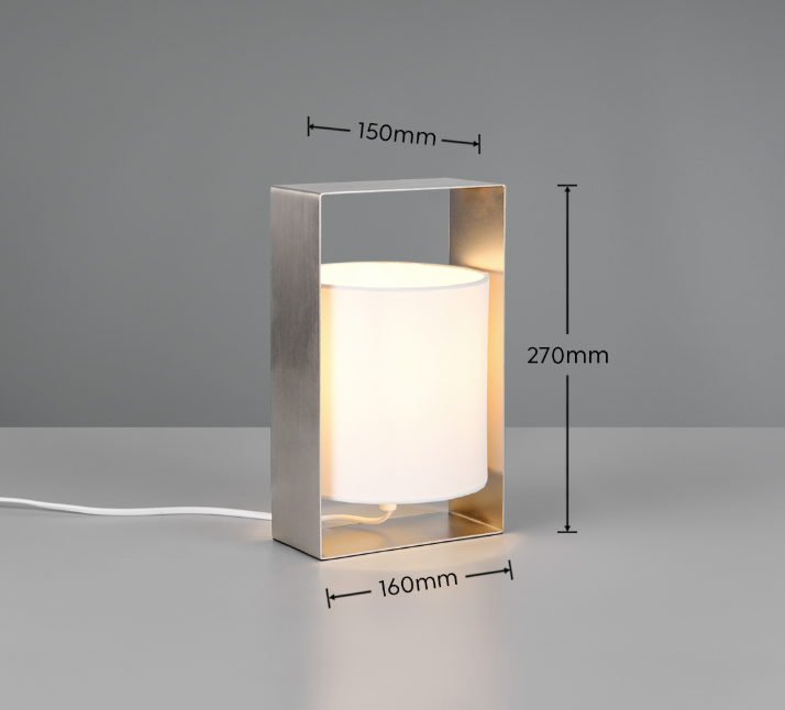 Deze moderne tafellamp heeft een stijlvol moderne uitstraling dankzij zijn metale behuizing in combinatie met een stoffen kap. De lamp is gemaakt uit metaal en uitgevoerd in een mat nikkel kleur. De lamp bedien je heel eenvoudig met de snoerschakelaar. Er zit en E27 fitting in geschikt voor max. 10W en er wordt standaard geen lichtbron meegeleverd.