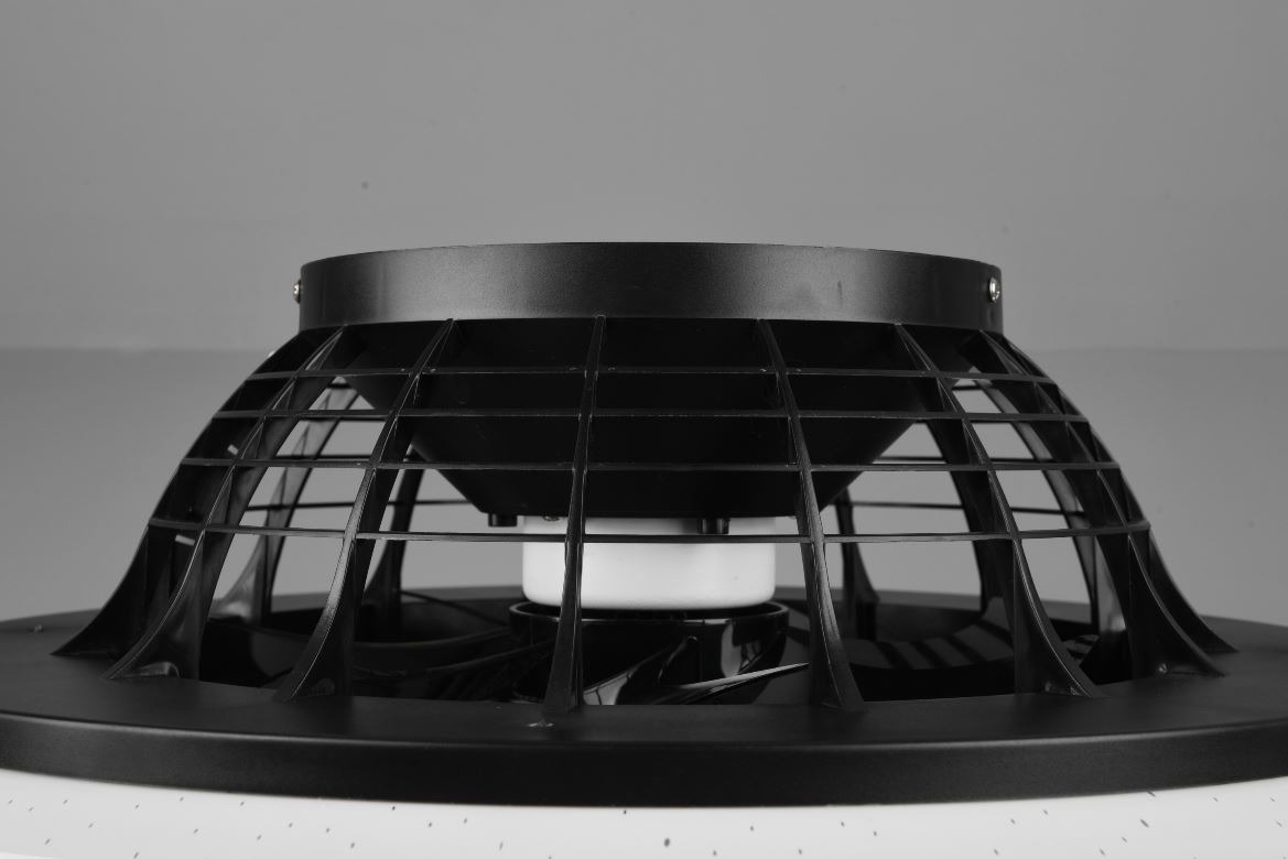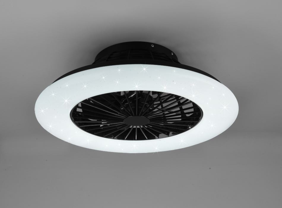 Een mooie ventilator voor het plafond uit de collectie van Trio. Deze moderne ventilator is gemaakt van kunststof in de kleur mat zwart. In deze plafondventilator zit een ingebouwde LED lamp met een wattage van 30W die ook nog eens traploos gedimd kan worden met de geïntegreerde dimmer en ook de lichttemperatuur kan worden aangepast (3000 - 6500K). De ventilator is geschikt voor montage aan het plafond en heeft 3 snelheidsniveaus die ingesteld kunnen worden met de meegeleverde afstandsbediening. Ook heeft dit product handige functies zoals een timer, een nachtlampfunctie en twee lichtpunten die apart geschakeld kunnen worden. Het opvallende armatuur heeft een schitterend sterreneffect.