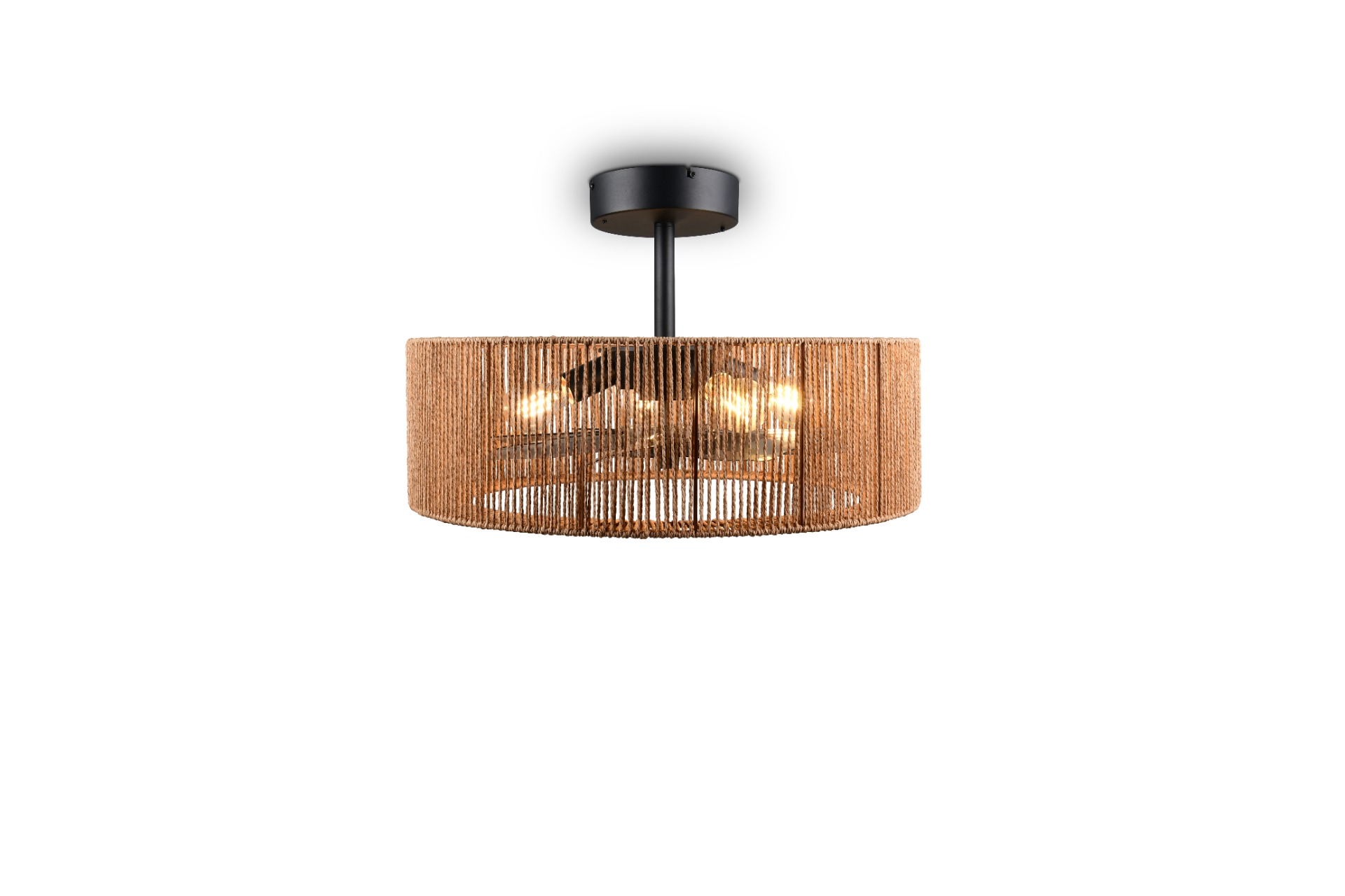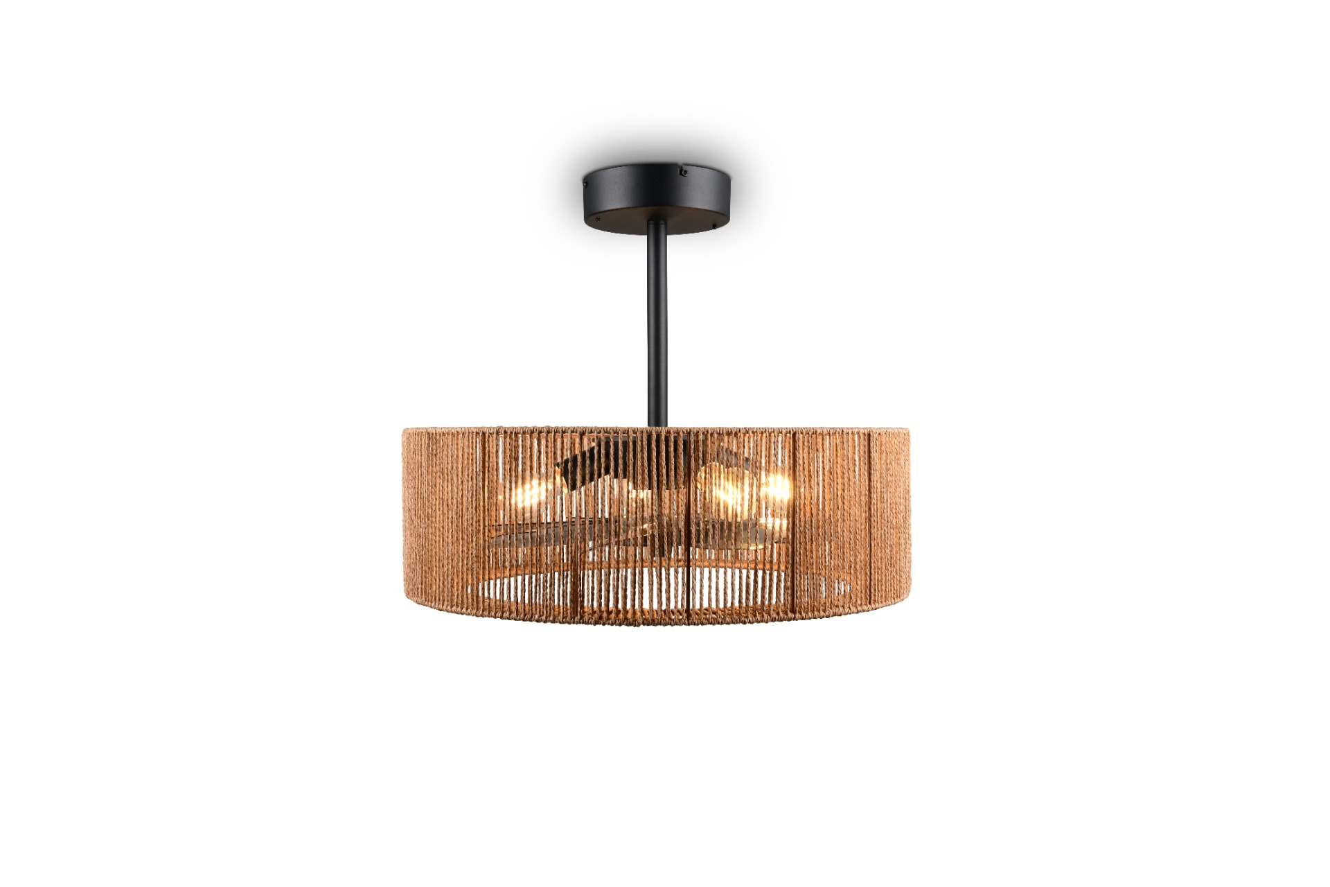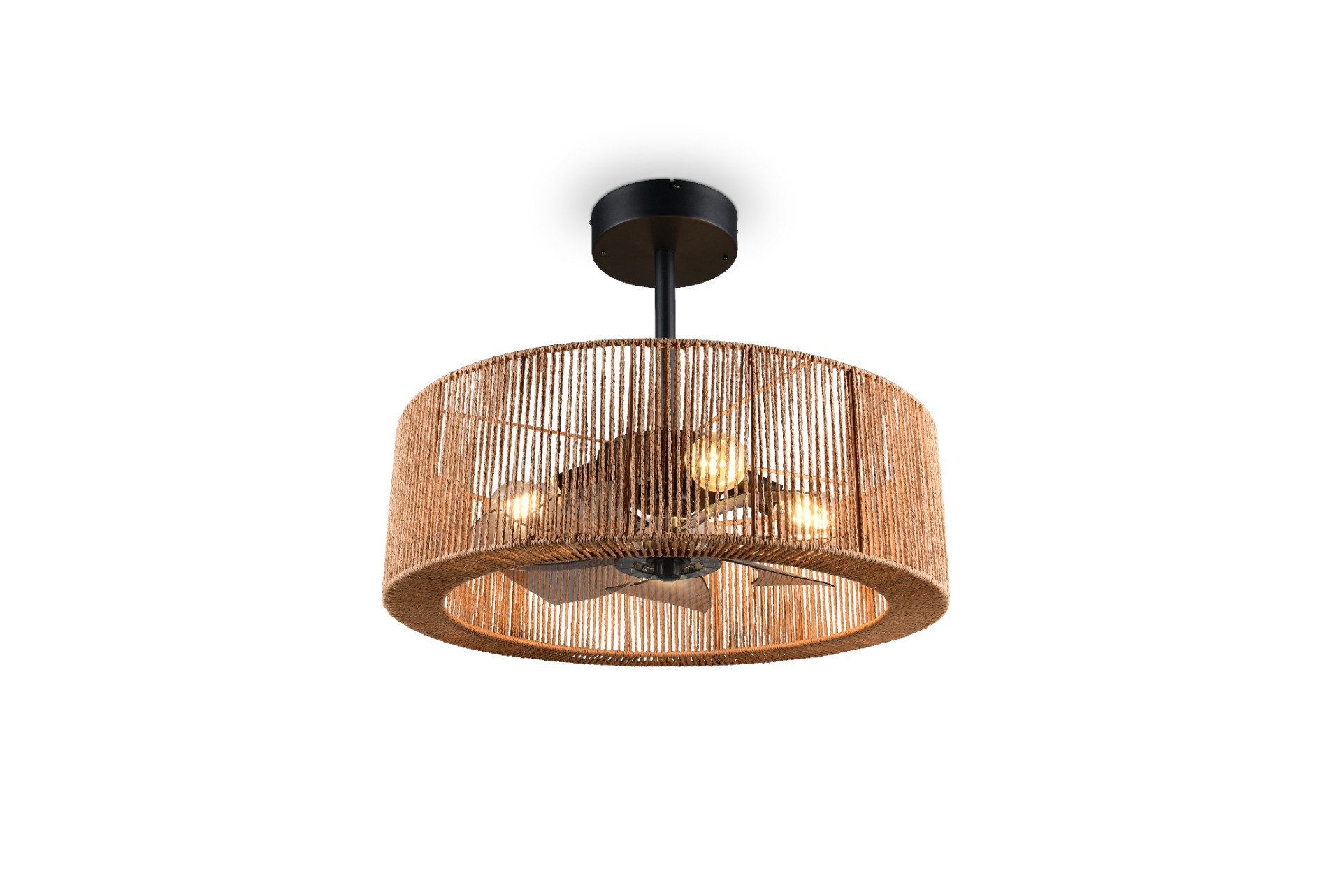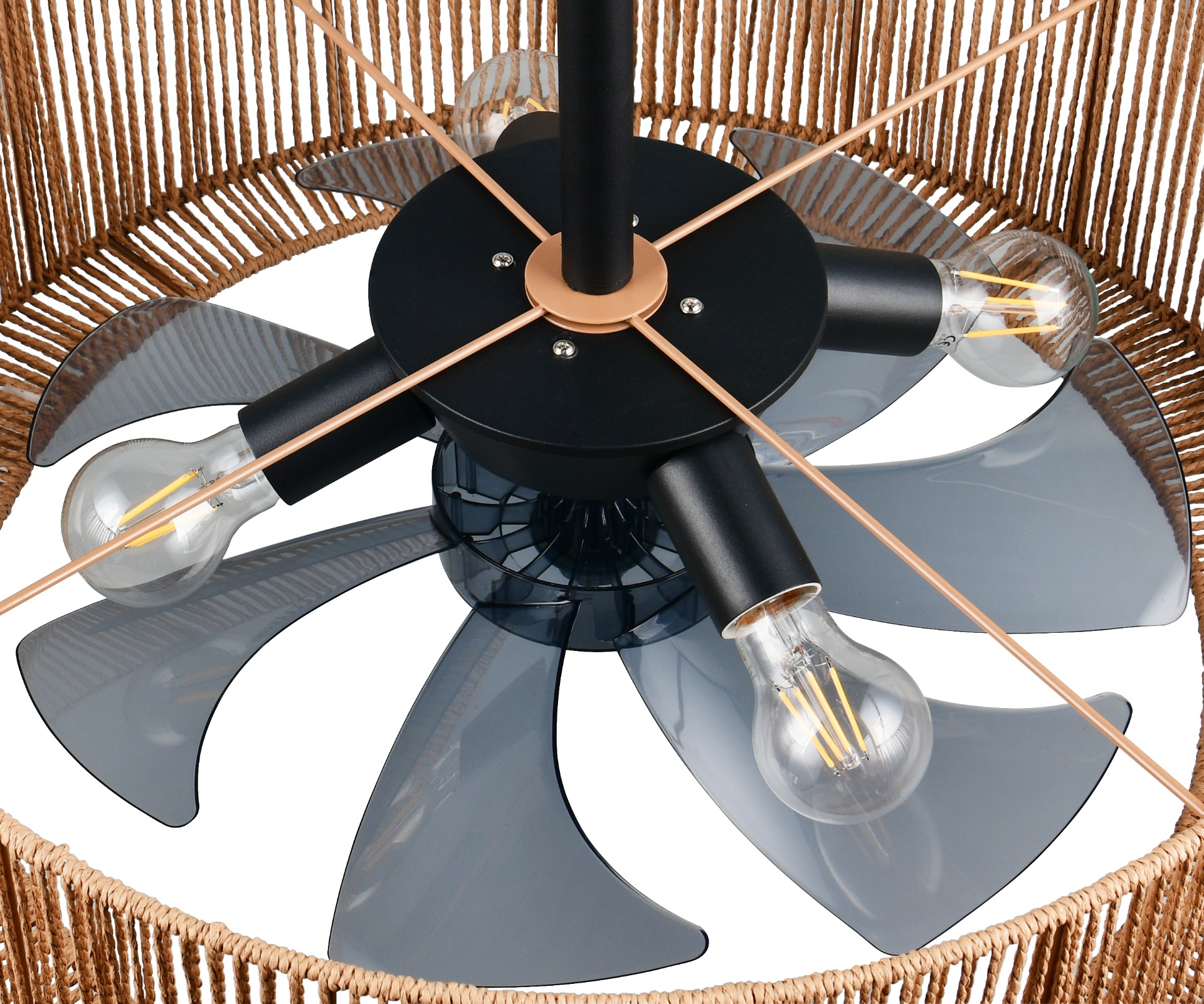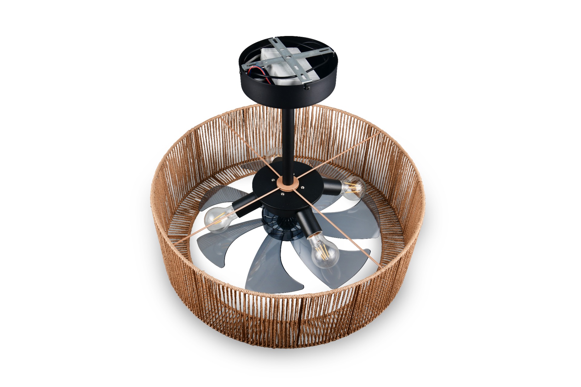 Een prachtig design met touwafwerking en toch de functionaliteiten van een plafondventilator. De Smillum plafondventilator is van alle markten thuis. Want deze ventilator is niet alleen mooi om naar te kijken, maar ook nog eens handig in gebruik. Er zitten 4 E27 fittingen in, ieder geschikt voor een lichtbron van max. 10W. De ventilator bedien je eenvoudig met de meegeleverde afstandsbediening en hiermee kan je verschillende dingen instellen waaronder 3 snelheden, timerfunctie en zomer/winterstand. Je kan zowel het licht als de ventilator apart bedienen, dus ze hoeven niet altijd samen aan te staan. Bij deze ventilator krijg je 2 stangen waardoor je kan kiezen op welke hoogte je de ventilator wil hangen 37 cm of 50 cm.