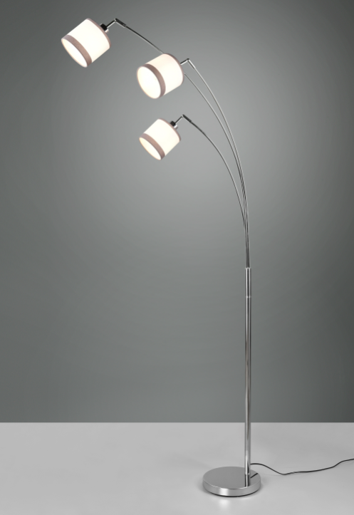 Een vloerlamp van het Duitse verlichtingsmerk Trio. De lamp is gemaakt van metaal met textiele kappen en heeft een mooie chromen kleur met witte kappen. Er kunnen drie lichtbronnen met fittingmaat E14 in geplaatst worden van max. 3x 28W (exclusief). De vloerlamp kan goed worden geplaatst in de woonkamer en heeft een handige voetschakelaar.