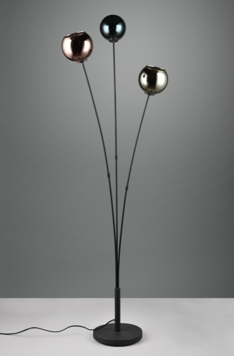 Een vloerlamp met modern/ retro-achtige uitstraling van het Duitse verlichtingsmerk Trio. De vloerlamp is gemaakt van metaal en glas in meerdere kleuren; blauw, groen en koperkleurig. De lamp wordt geleverd exclusief lichtbronnen met kleine E14 fittingen geschikt voor max. 3x 10W. De lamp kan goed worden geplaatst in bijvoorbeeld de woonkamer. Er zit een handige voetschakelaar in het snoer verwerkt.