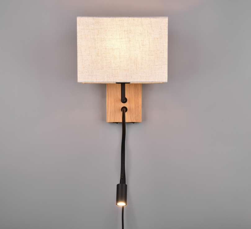 Een wandlamp met landelijk/moderne uitstraling van het Duitse verlichtingsmerk Trio. De wandlamp is gemaakt van natuur hout en textiel in een bruine natuurkleur met witte lampenkap. De lamp wordt geleverd exclusief lichtbron met E27 fitting geschikt voor max. 28W. Het kleine leeslampje heeft wél een lichtbron inclusief, namelijk een Osram LED met 3,1W. De lampen zijn apart schakelbaar en er zitten hiervoor twee schakelaars aan de onderkant van het armatuur. De lamp is perfect als nachtlampje of om bij te lezen.