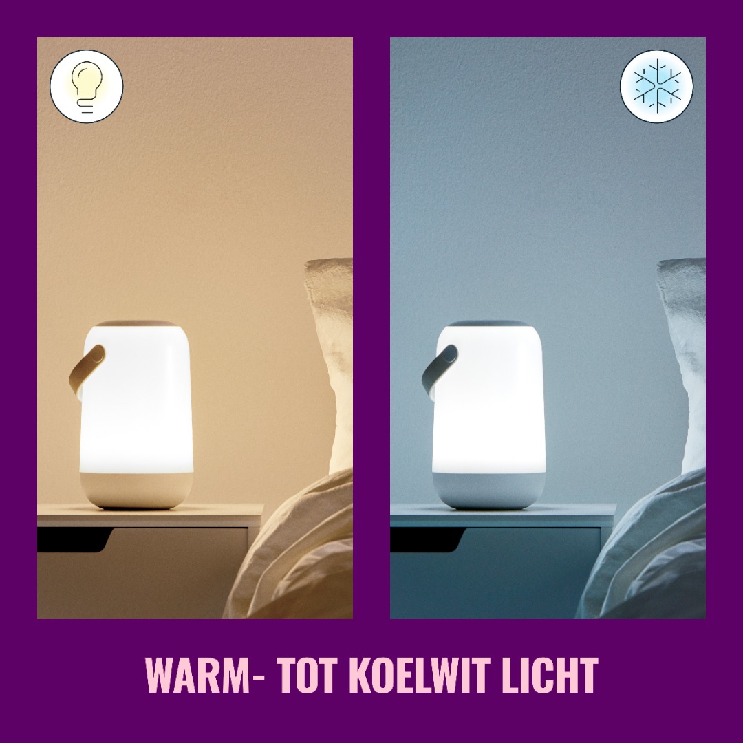 Met de slimme verlichting van WiZ kunt u alle kanten op! Sluit de lamp gelijk aan op je Wi-Fi netwerk en maak gebruik van alle mogelijkheden van aan/uitzetten, instellen van timers en het dimmen van de lamp. Deze oplaadbare Portable Light kan je ook nog eens eenvoudig meenemen naar binnen maar ook naar buiten! Zo maak je ook de zomeravonden nog extra gezellig. Kies uit een van de miljoenen kleuren en mede door het dual zone effect kan je 2 kleuren mooi in elkaar over laten kopen. Boven op de lamp zit het touchpanel waarmee je lamp ook kunt bedienen en vooraf ingestelde lichtscènes eenvoudig kan oproepen.
