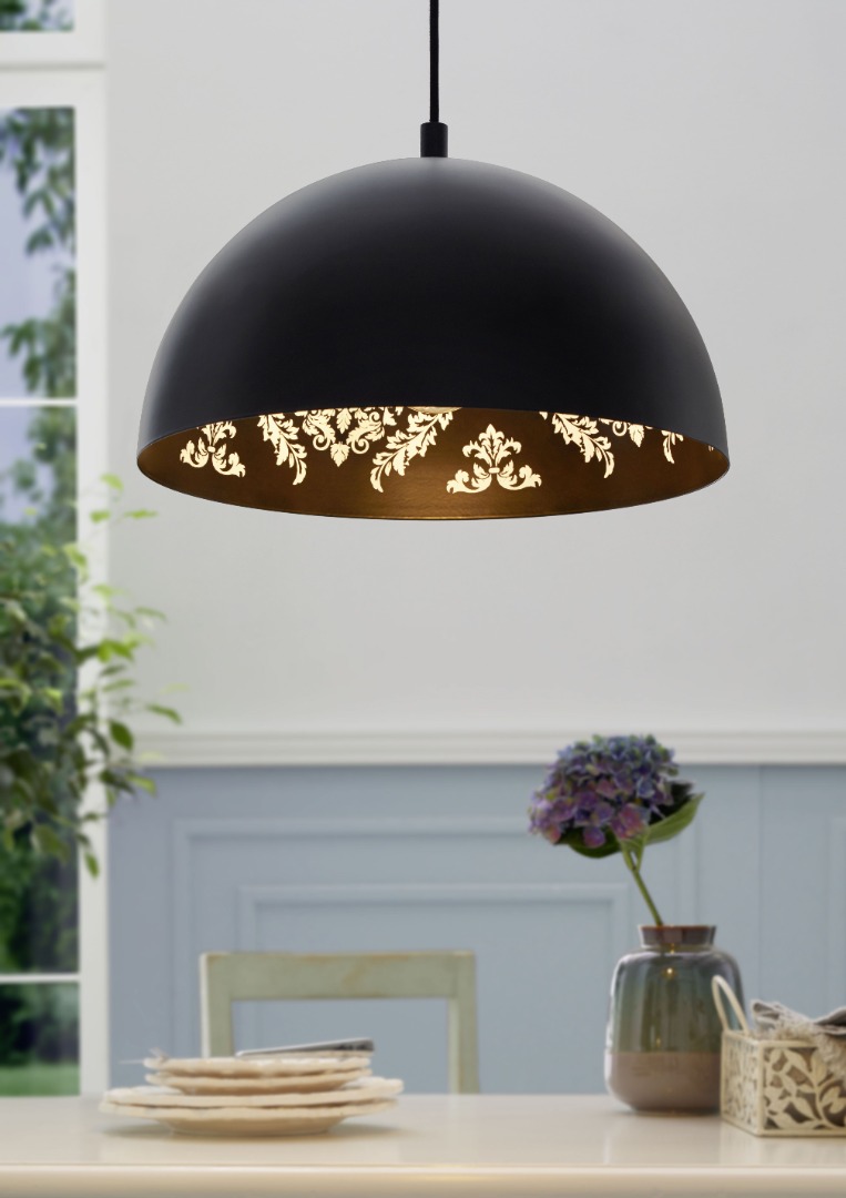 Een mooie hanglamp uit de hanglampen collectie van Eglo. De lamp heeft een industriële look door de interessante geheel zwarte kleur en staal als materiaal. Ook heeft de lamp een uniek motief wat een leuk effect geeft. De lamp wordt exclusief lichtbronnen geleverd en heeft een E27 fitting geschikt voor max. 40W. Deze lamp staat goed in de eetkamer, bijvoorbeeld boven de eettafel, maar kan ook zeker ergens anders in de woonkamer bijvoorbeeld.