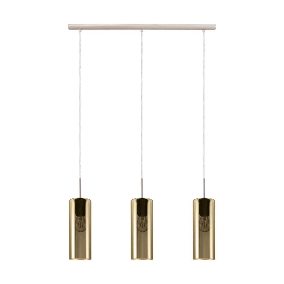 Een mooie hanglamp uit de hanglampen collectie van Eglo. De lamp heeft een simplistische uitstraling, gemaakt van staal in een nikkel-matte kleur met gestoomd glas in een goudkleur. De lamp wordt exclusief lichtbron geleverd en heeft E27 fittingen geschikt voor max. 3x 15W. Deze lamp staat goed in de eetkamer, bijvoorbeeld boven een mooie rechthoekige eettafel.