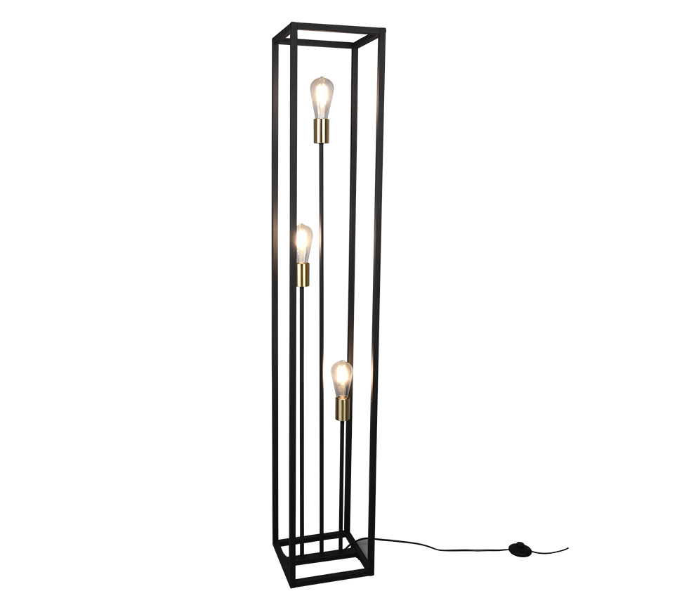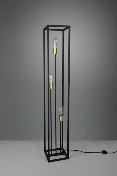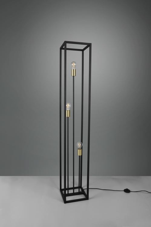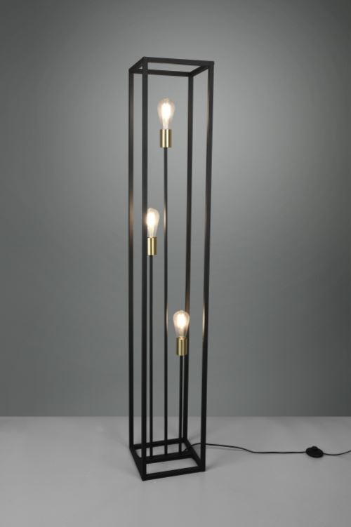 Een vloerlamp van Trio uit de RL-collectie. Deze staande lamp is gemaakt van metaal en is uitgevoerd in de kleur mat zwart en heeft een klein gouden accent (fittinghouders). Binnenin het rechthoekige geraamte bevinden zich drie lichtpunten. Er is plaats voor drie E27-fittingen die geschikt zijn voor een max. wattage van 10W. Deze armatuur van Trio wordt exclusief lichtbronnen geleverd. U kunt hierdoor zelf bepalen hoeveel licht u wilt hebben. Deze lamp met moderne uitstraling past in veel interieurs en kan goed worden geplaatst in de woonkamer naast de bank of een fauteuil bijvoorbeeld. De vloerlamp wordt inclusief voetschakelaar geleverd.