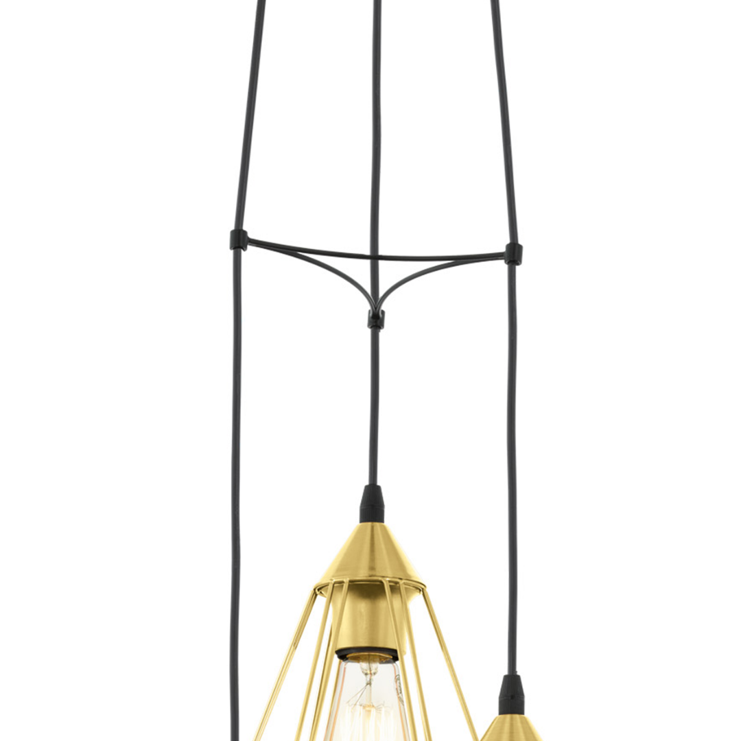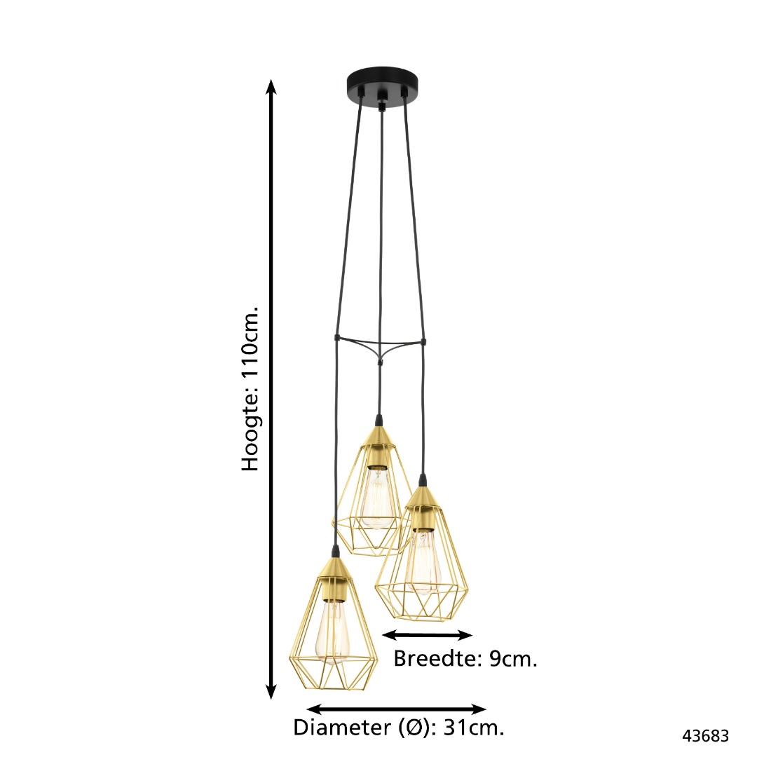 Een hanglamp uit de lighting collectie van Eglo met een vintage look. De lamp is gemaakt van staal en heeft een geelkoper-geborstelde kleur. De lamp heeft E27-fittingen en wordt exclusief lichtbronnen geleverd. Het is geschikt voor een max. wattage van 3x 60W. De lamp heeft een bijzondere vorm, waardoor het een mooie, unieke uitstraling geeft aan je huis. De lamp is een goed voorbeeld van een lamp die mooi in de woonkamer of boven de eettafel kan worden opgehangen.