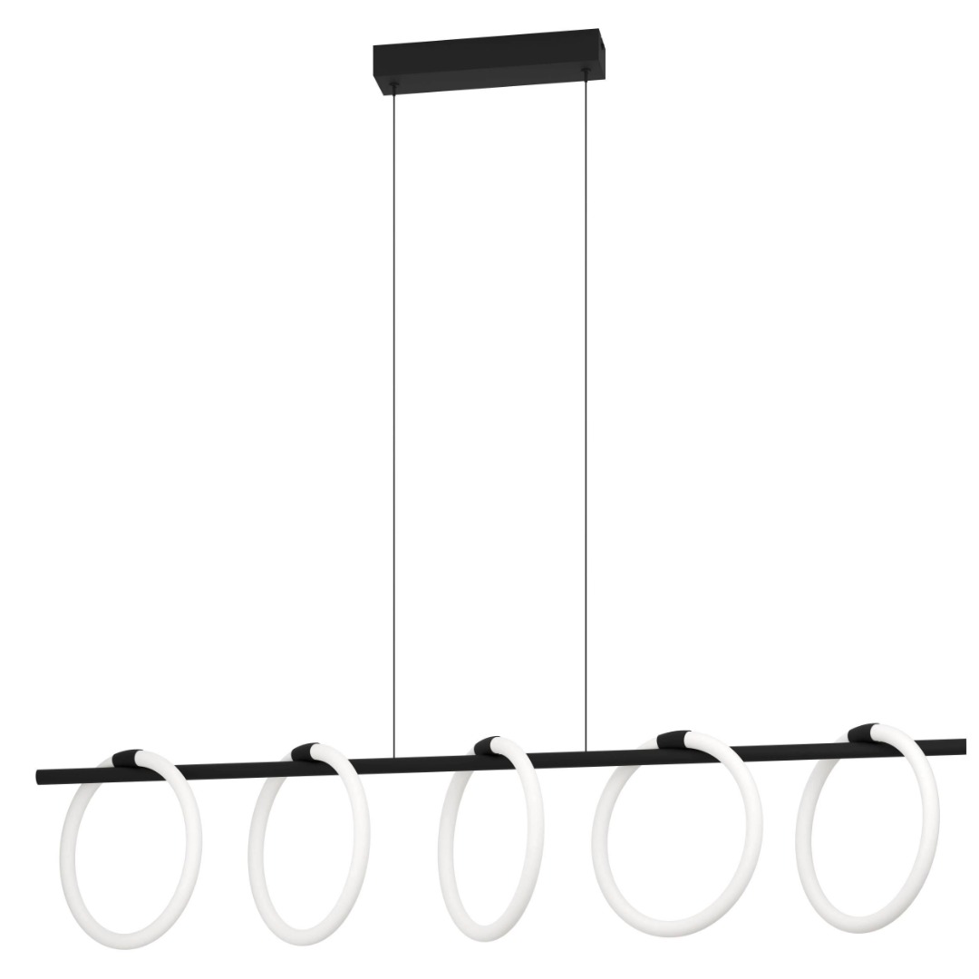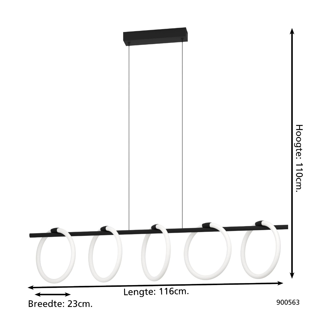 Een hanglamp uit de collectie van Eglo met een moderne uitstraling. De lamp is gemaakt van staal en kunststof in de kleuren zwart en wit. Deze lamp is een mooi voorbeeld van een lamp die je in de eetkamer kan hangen boven een eettafel. De lamp wordt inclusief LED lichtbronnen geleverd met een wattage van 5x 7W.