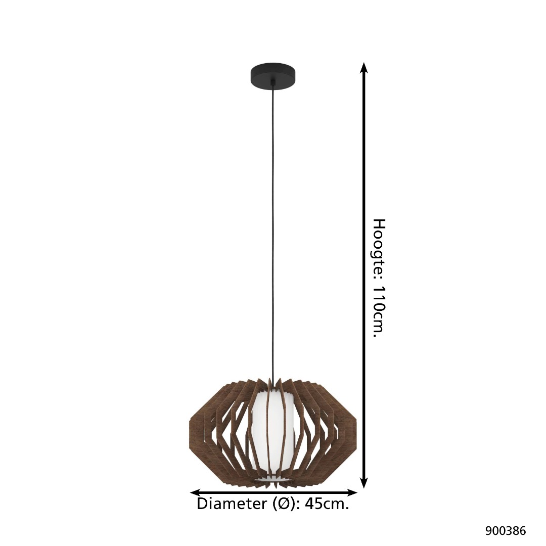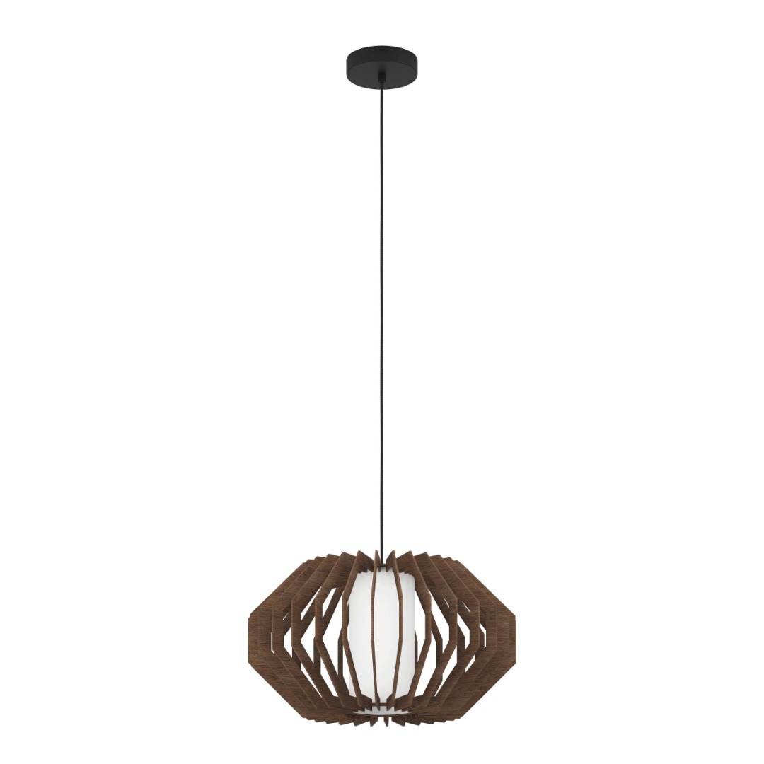 Een hanglamp uit de collectie van Eglo met een mooie uitstraling. De lamp is gemaakt van staal, hout en glas en heeft een bruine kleur met zwart en een wit glas. Deze lamp is een mooi voorbeeld van een lamp die je in de eetkamer kan hangen boven een eettafel. De lamp wordt exclusief lichtbron geleverd en is geschikt voor max. 1x 40W met E27-fitting.
