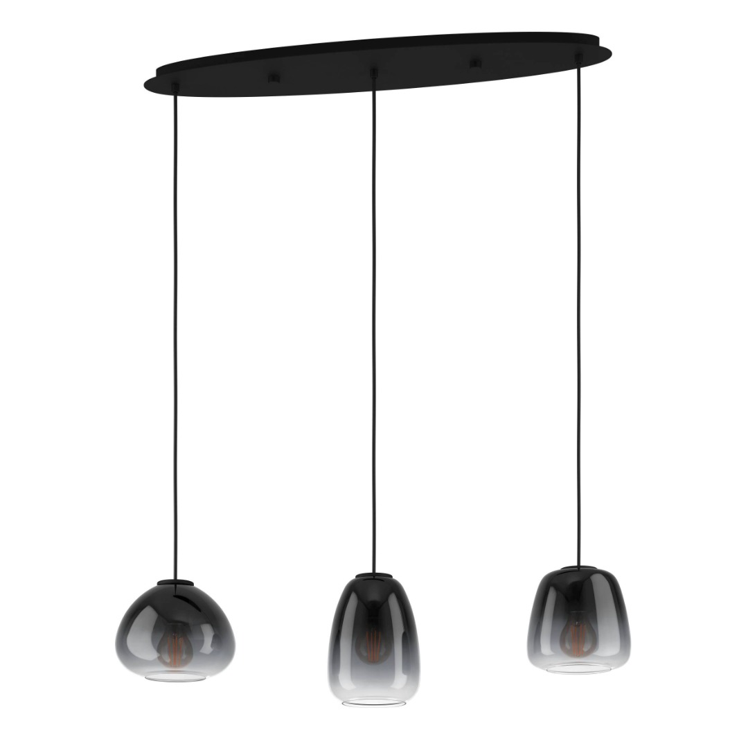Een mooie hanglamp uit de hanglampen collectie van Eglo. De lamp heeft een moderne en unieke uitstraling en is gemaakt van staal en gestoomd glas in een zwarte kleur en zwart/grijs transparante glazen. De lamp wordt exclusief lichtbronnen geleverd en is geschikt voor een wattage van max. 3x 40W. Deze lamp staat goed in de eetkamer boven een rechthoekige eettafel.