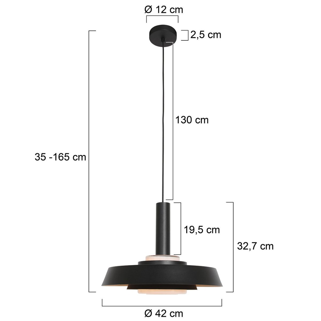 Zwarte hanglamp met opvallende binnenkant uit de Anne Light & Home collectie van Steinhauer. De hanglamp heeft een E27 fitting geschikt voor maximaal 40 Watt. De lamp heeft een lengte van maximaal 165 cm en is bij montage is hoogte te verstellen. Goed toepasbaar in een modern of retro interieur. De lamp is gemaakt van aluminium en glas.