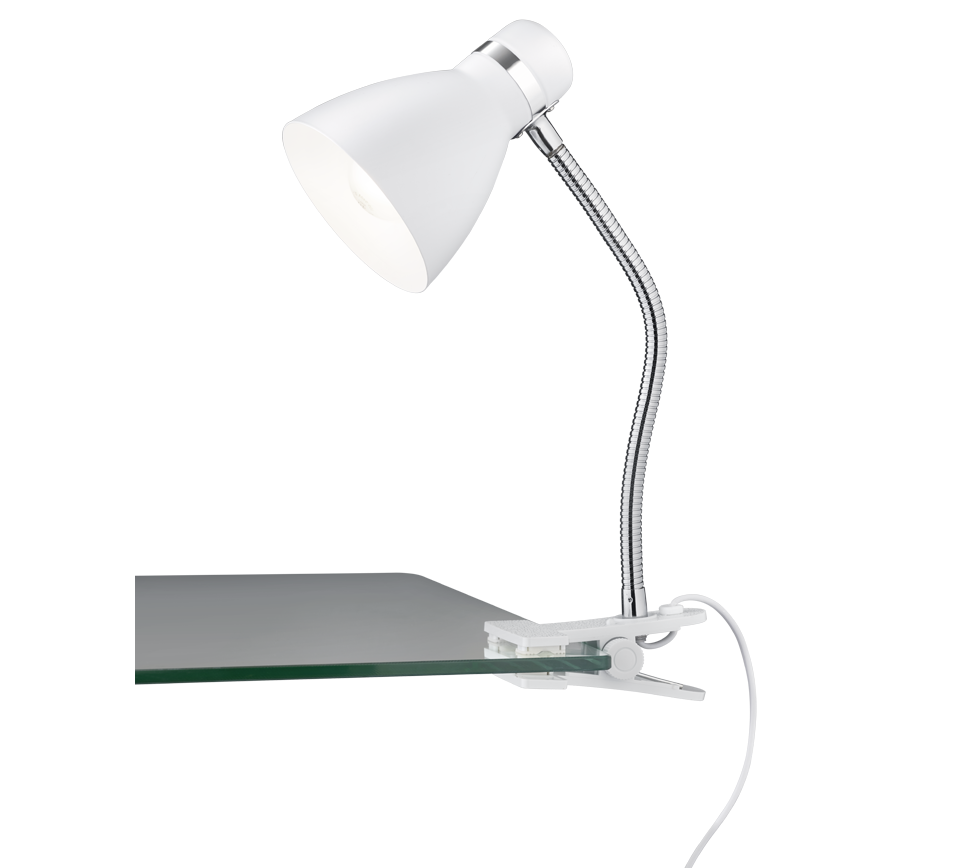 Met zijn pure design is deze klemlamp de perfecte lichtbron bij bureau of werkbank. Klemlamp Harvey is vervaardigd uit wit- en chroomkleurig metaal. De flexibele arm van deze lamp zorgt ervoor dat het licht doelmatig kan worden gericht. De klem kan geplaatst worden op een oppervlak met een maximale dikte van 46mm. Het trechtervormige kapje heeft een diameter van 11 cm en biedt plaats aan één E27-fitting (max. 10W). Deze lamp wordt exclusief lichtbron geleverd. Op het anderhalve meter lange snoer bevindt zich een snoerschakelaar.