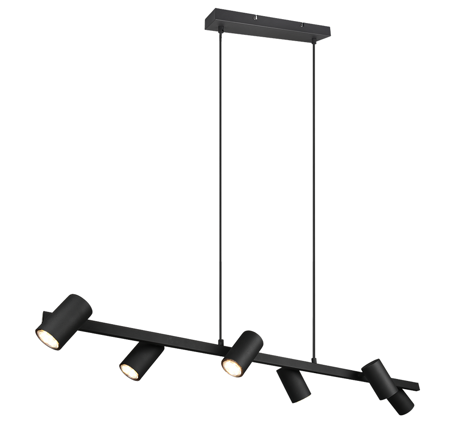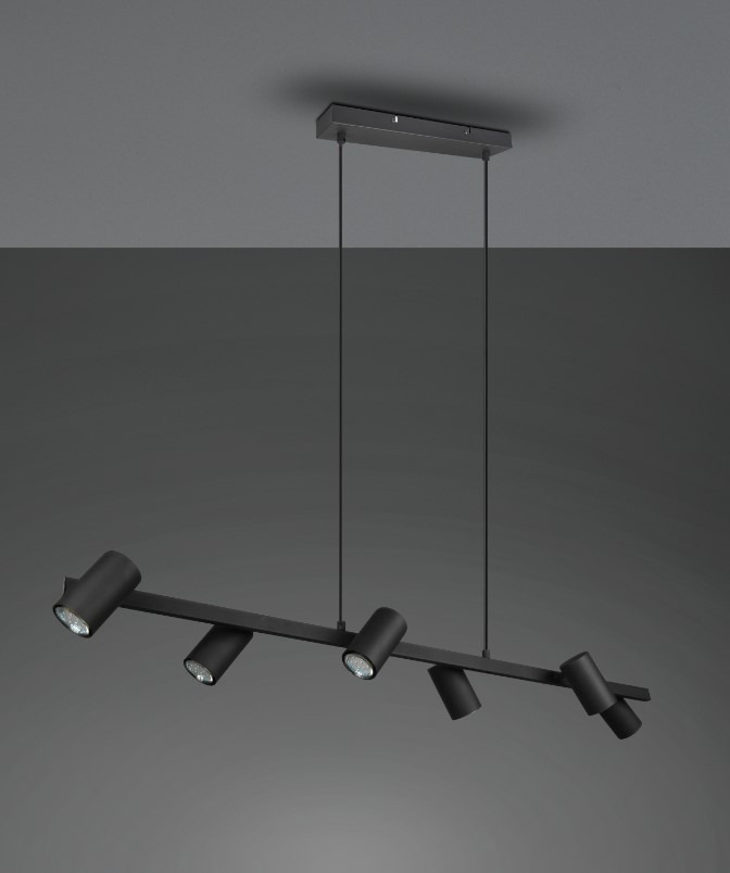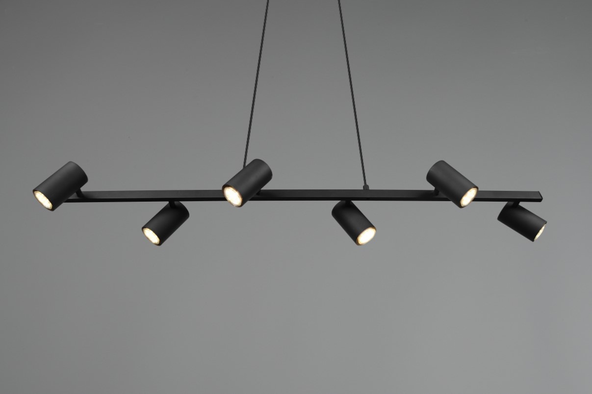 Een hanglamp van het Duitse verlichtingsmerk Trio. Deze mimimalistisch vormgegeven lamp is gemaakt van metaal en uitgevoerd in de kleur mat zwart. De hanglamp kan goed worden toegepast boven de eettafel in de eet- of woonkamer om u van functioneel licht te voorzien. Deze lamp beschikt over zes lichtpunten. De cilindervormige lichtpunten hebben een diameter van 6 cm en een lengte van 10,5 cm. Er is plaats voor zes GU10-fittingen welke geschikt zijn voor een max. wattage van 35W. Deze lamp wordt exclusief lichtbronnen geleverd. U kunt hierdoor zelf bepalen hoeveel licht u wilt hebben. Wij adviseren in dit geval energiezuinige LED spots, deze zijn afzonderlijk bij te bestellen. De hanglamp kan in de hoogte aangepast worden.