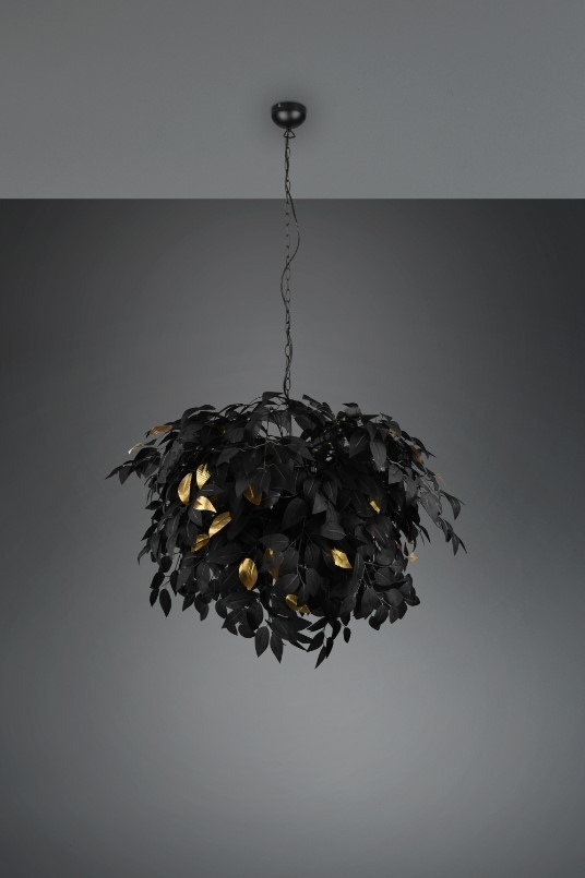 Een extravagante hanglamp van het Duitse verlichtingsmerk Trio. Deze sfeermaker geeft de ruimte meteen karakter. De lamp is gemaakt van metaal en uitgevoerd in de kleur mat zwart. De zwart en gouden decoratieve bladeren zijn gemaakt van kunststof. Deze flamboyante armatuur heeft een diameter van 70 cm. De lamp kan goed worden toegepast boven de eettafel in eetkamer of woonkamer. Deze hanglamp wordt exclusief lichtbron geleverd, u kunt hierdoor zelf bepalen hoeveel licht u wilt hebben. Er is plaats voor vier E14-fittingen die geschikt zijn voor een max. wattage van 28W. De lamp kan variabel in hoogte aangepast worden.