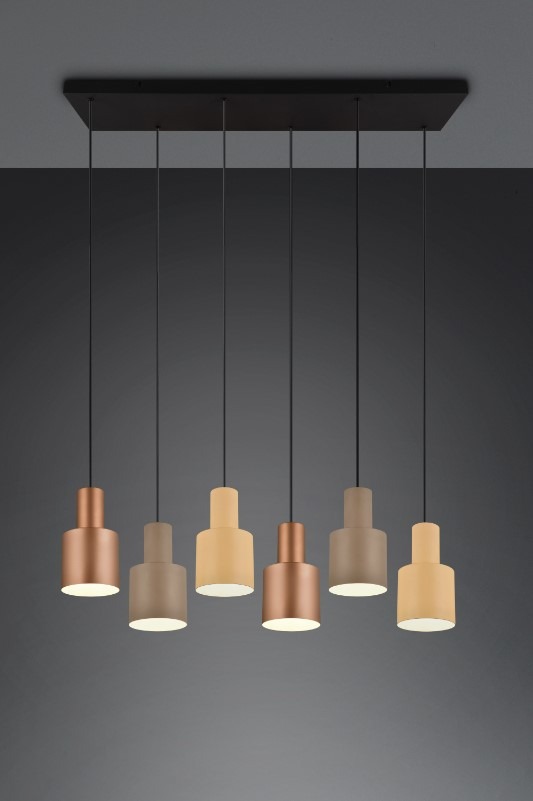 Een hanglamp van het Duitse verlichtingsmerk Trio. De lamp heeft zes lichtpunten welke afzonderlijk in hoogte aangepast kunnen worden. De metalen kapjes in de kleuren coffee, beige en taupe hebben een diameter van 12cm en bieden plaats aan één E27-fitting. Deze armatuur wordt exclusief lichtbronnen geleverd. Deze langwerpige hanglamp zou goed tot zijn recht komen boven een eveneens langwerpige eettafel of boven een kookeiland. Plaats de hanglamp op een externe dimmer en u zet moeiteloos de juiste lichtsfeer neer.