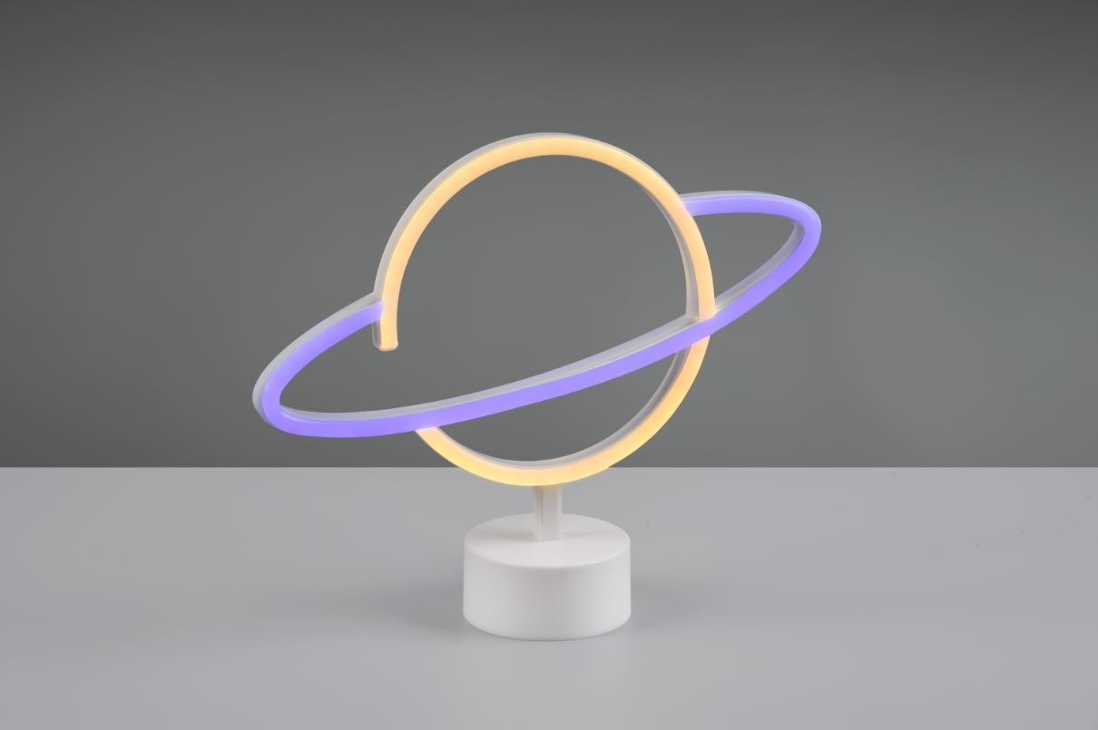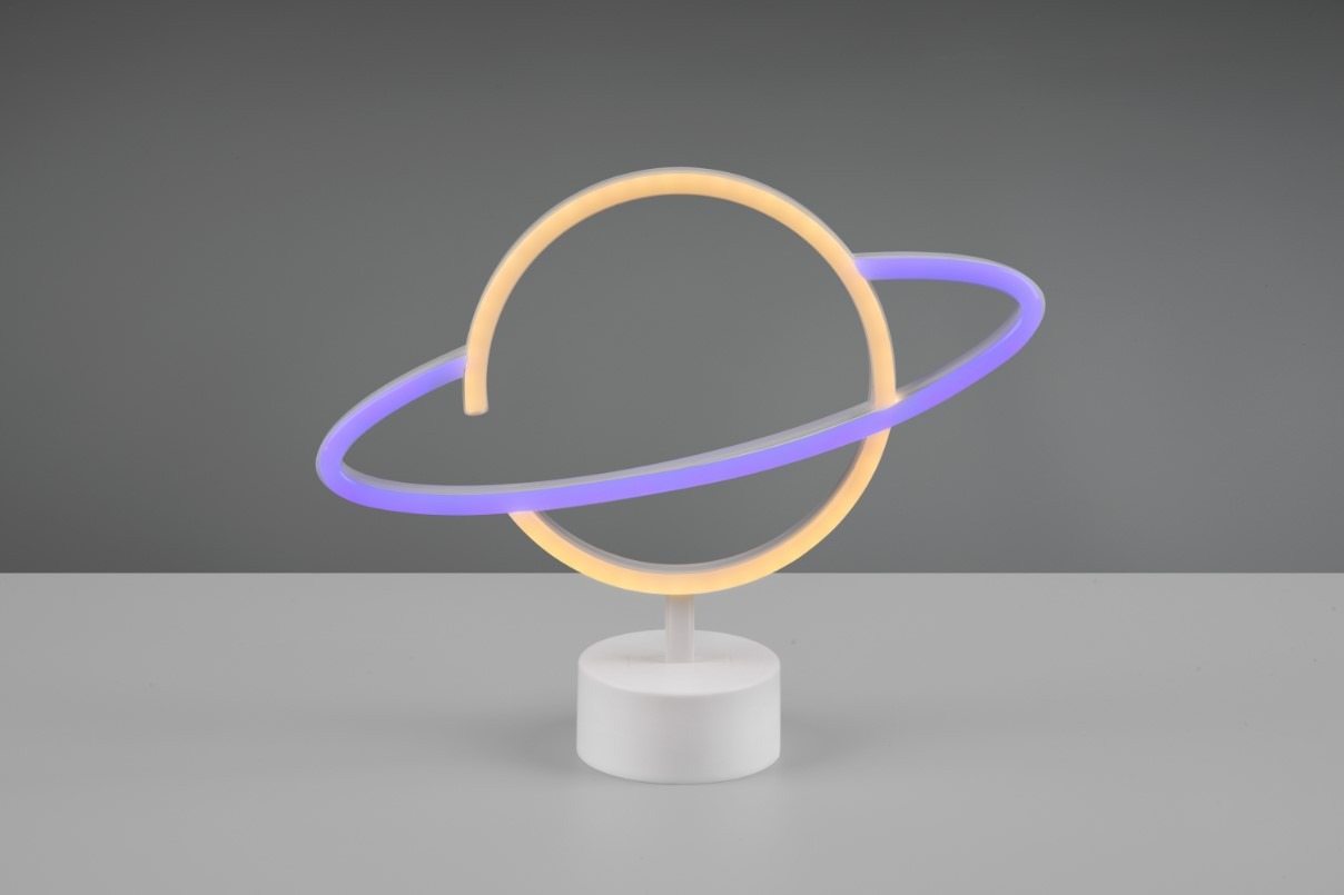 Deze lamp met planeetdesign is een leuk decoratief element in kinderkamers. Dit hemellichaam verspreidt gezellig licht. De lamp is voorzien van een aan-/uitschakelaaar. Sluit deze lamp aan op het lichtnet met de meegeleverde USB-kabel. Of plaats de tafellamp daar waar je wil, want hij werkt ook met 3 AA-batterijen (niet meegeleverd). Dit tafellampje is vervaardigd uit wit kunststof en beschikt over moderne LED-technologie. De LED-lichtbron genereert minder warmte dan conventionele halogeenlampen wat het lampje veilig voor kinderkamers maakt.
