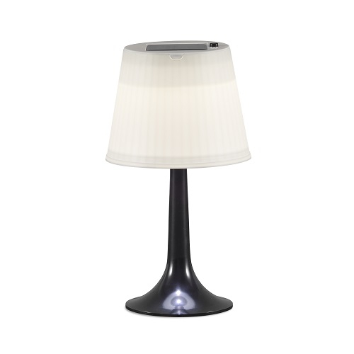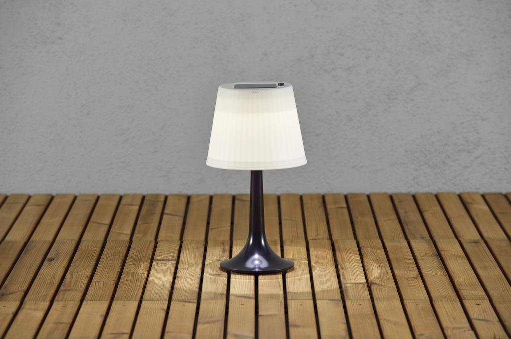 Een leuke tafellampje van Konstsmide. De lamp werkt op batterijen (inbegrepen) en op zonne-energie dus geen ingewikkeld installatiewerk. De lamp heeft een schemerschakelaar, welke de lamp handing inschakelt als het begint te schemeren maar ook weer automatisch uitgaat als het licht wordt.