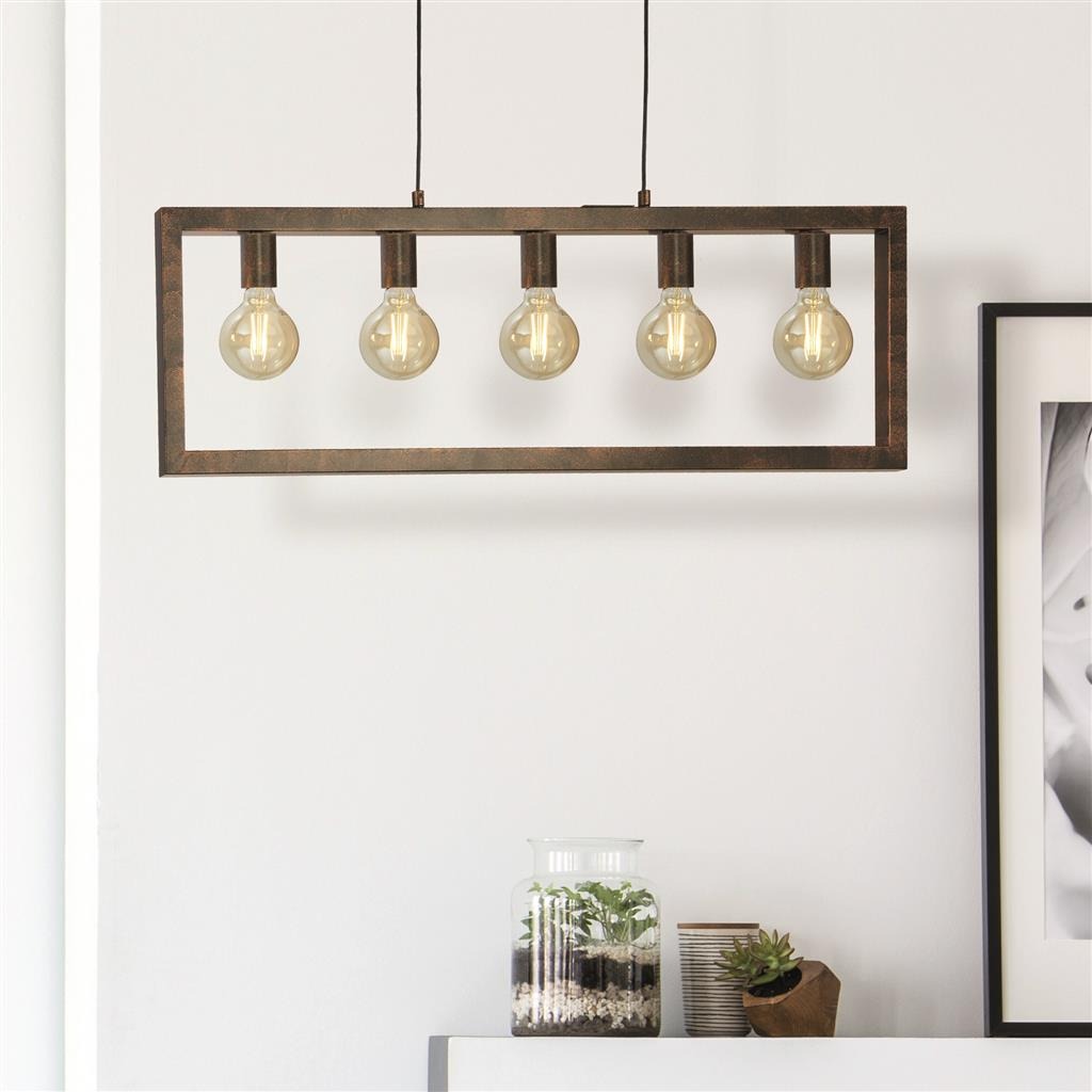 Een opvallende hanglamp uit de Oblong collectie van het merk Searchlight. De lamp heeft maar liefst 5 fittingen die geschikt zijn voor lichtbronnen met een E27 fitting en max. 60 watt per lichtbron. De roestige bruine metalen kleur zorgt dat de lamp mooi tot zijn recht zou komen in een industrieël interieur. De Oblong is bij installatie in hoogte te verstellen naar wens.