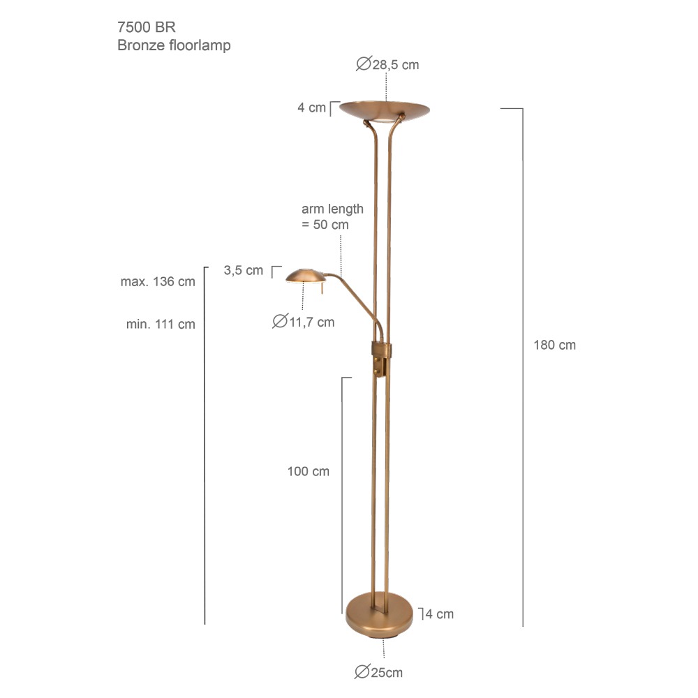 Deze 2-lichts vloerlamp komt uit de Mexlite collectie van Steinhauer. De lamp is gemaakt van bronskleurig geborsteld staal. De leesarm is dankzij twee buigpunten eenvoudig te richten. Het licht van de leesarm en de uplight zijn apart van elkaar te bedienen. De vloerlamp heeft namelijk een dubbele draaidimmer. De uplight en de leesarm hebben een vaste LED module. De hoogte van deze lamp is 180 centimeter en de lamp is inclusief snoer van 200 centimeter.