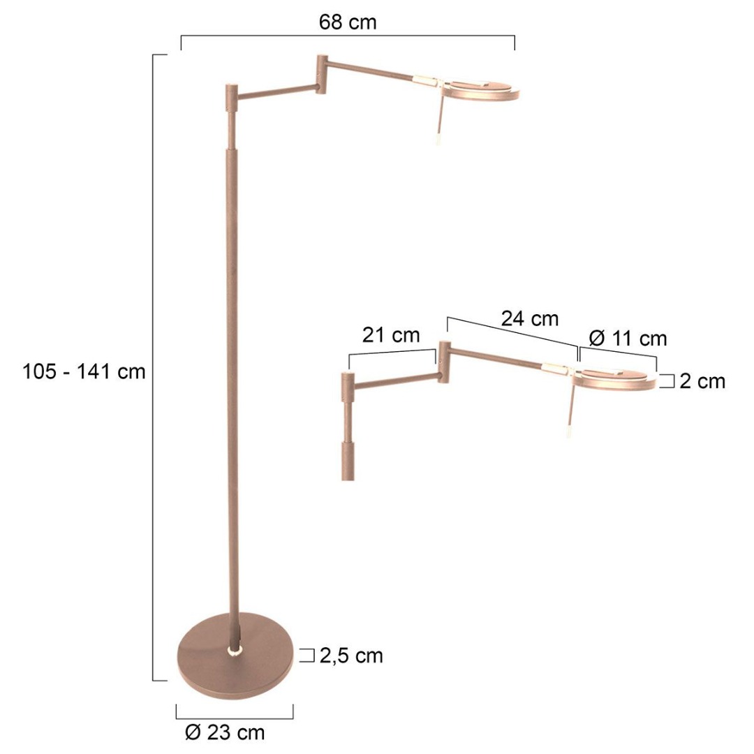 Deze klassieke vloerlamp komt uit de Turound LED collectie en heeft een bronzen kleur met helderglas. De lamp heeft een ingebouwde (vervangbare) LED module van 10 Watt met 2200 - 4000 Kelvin en 1000 Lumen. De lamp is tevens voorzien van pushdimmer, kort indrukken staat voor aan/uit en lang indrukken staat voor het dimmen van de lamp. De hoogte van de lamp is variabel van 100 centimeter tot 140 centimeter. De lamp is handig kantelbaar en draaibaar zodat u het licht kunt schijnen naar wens.
