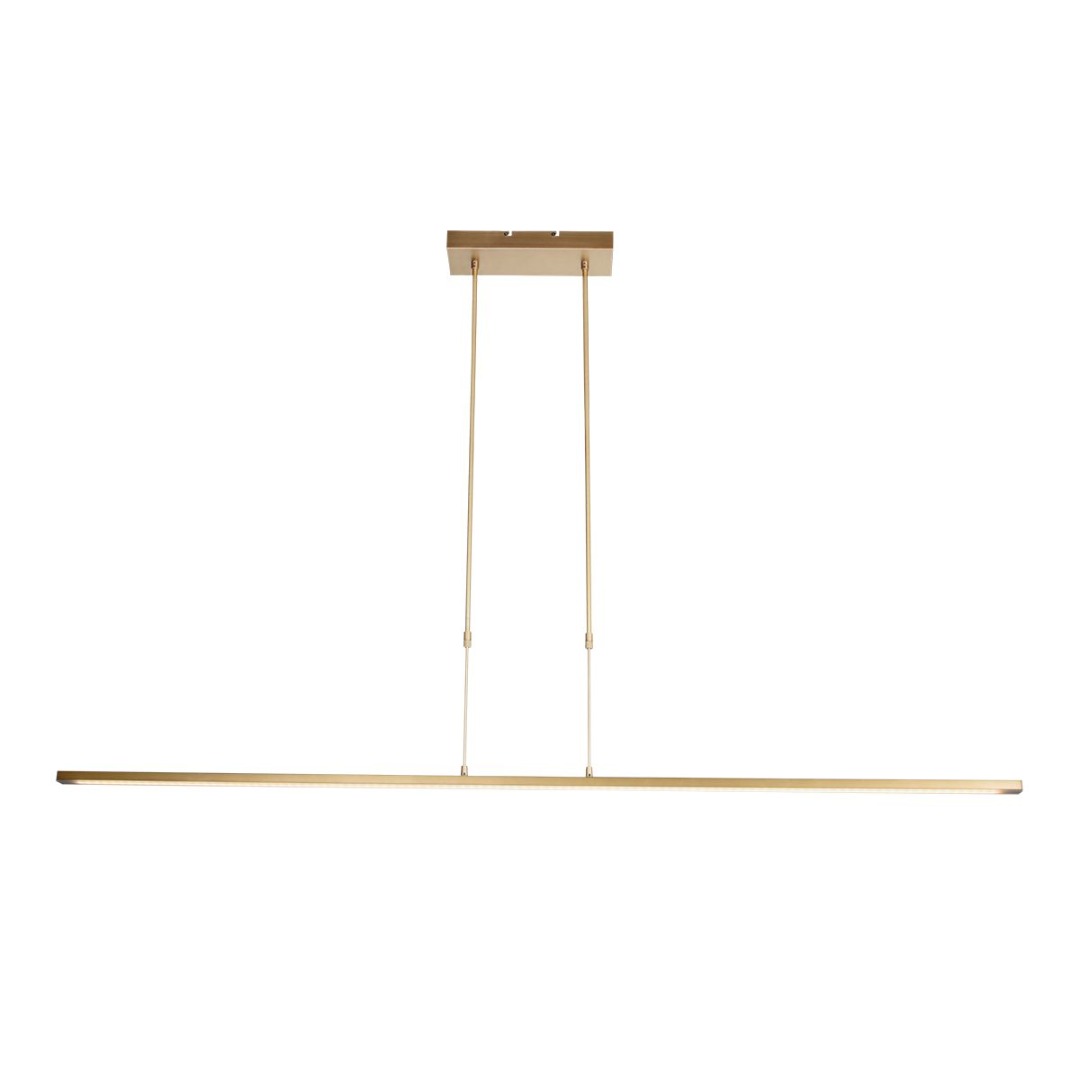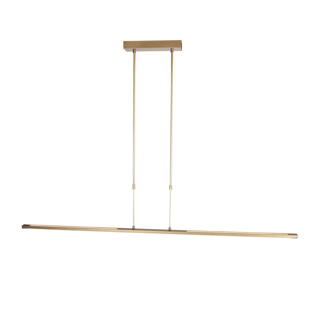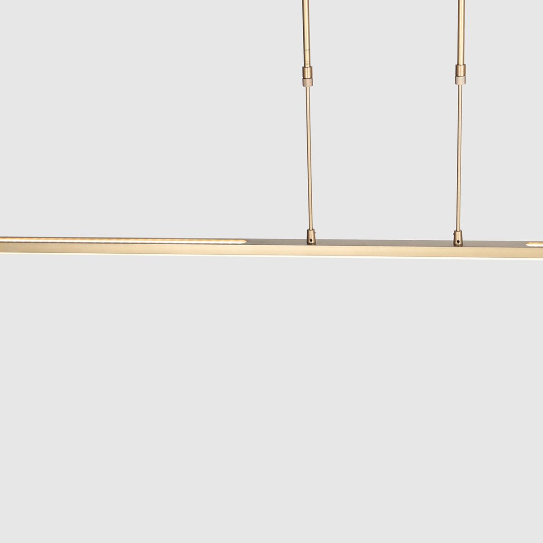 Gouden hanglamp met strak design uit de Zelena LED collectie. De lamp is zeer functioneel doordat zowel de boven als onderkant 2 lichtpunten hebben. De lamp is te dimmen door middel van de pushdimmer op het armatuur, de kleurtemperatuur is instelbaar van 2200K tot maximaal 4000K. U kunt de lamp praktisch in hoogte verstellen van 82 cm tot 117 cm. De lamp is voorzien van led lichtbronnen.