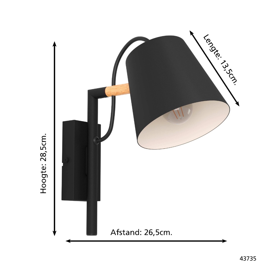 Een wandlamp uit de collectie van Eglo met een moderne uitstraling.  Deze wandlamp is gemaakt van staal en hout en heeft een zwarte kleur met een bruin detail en cremekleurige binnenkant van de kap. Deze lamp staat prachtig in de hal, woonkamer of slaapkamer. De lamp heeft een E14 fitting, wordt zonder lichtbron geleverd en is geschikt voor een wattage van max. 40W.