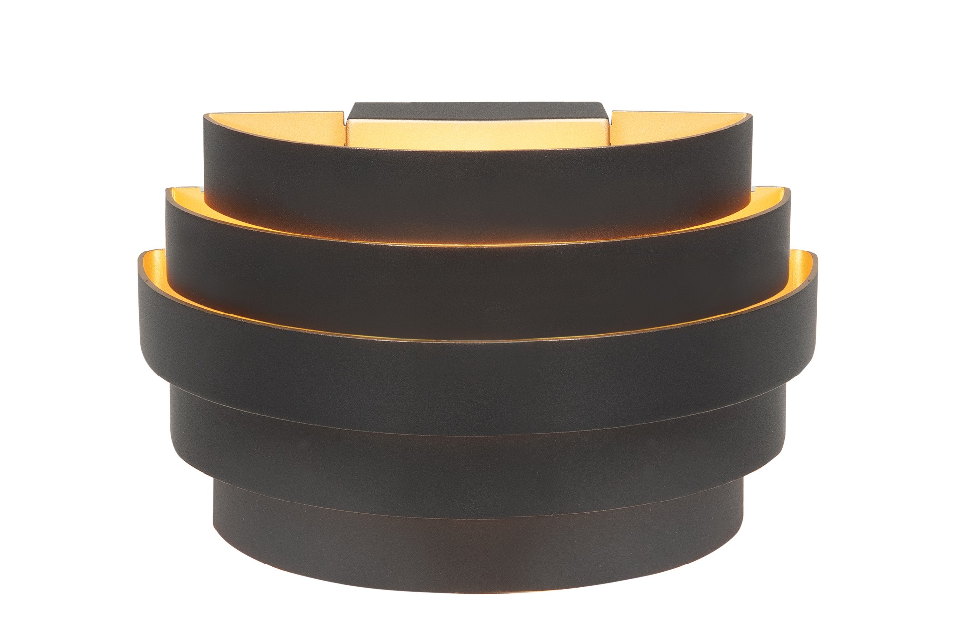 Een prachtige wandlamp uit de Scudo collectie van Highlight. De lamp bestaat uit 5 halve cirkels welken open zijn, dus het licht schijnt prachtig tussen de cirkels door, zowel naar boven als beneden. De lamp heeft een zwarte buitenkant een een gouden binnenkant. Erg mooi om bijvoorbeeld in uw hal of woonkamer te plaatsen. De lichtbron wordt bij deze lamp niet meegeleverd en de lamp een een G9 fitting geschikt voor lichtbronnen tot maximaal 33W.