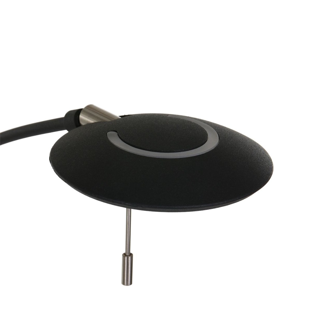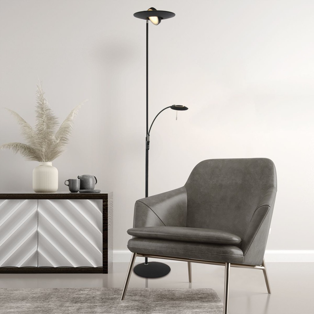 Klassieke vloerlamp uit de Zenith LED serie. De lamp is gemaakt van metaal en heeft een prachtige zwarte kleur. De lamp is voorzien van een leeslamp en een uplighter. Beide lampen zijn voorzien van een vervangbare LED module. De leeslamp heeft een LED module van 6 Watt met 2200 Lumen en de uplighter heeft een LED module van 30 Watt met 2200 Lumen. Beide lampen zijn afzonderlijk van elkaar dimbaar en lichtkleur instelbaar van 2200 Kelvin (warm geel licht) tot 4000 Kelvin (fel wit licht). Te bedienen middels de pushdimmers op de buis, kort indrukken staat voor aan/uit, lang indrukken staat voor het dimmen van de lamp, 2x indrukken en vasthouden staat voor het instellen van de lichtkleur.
