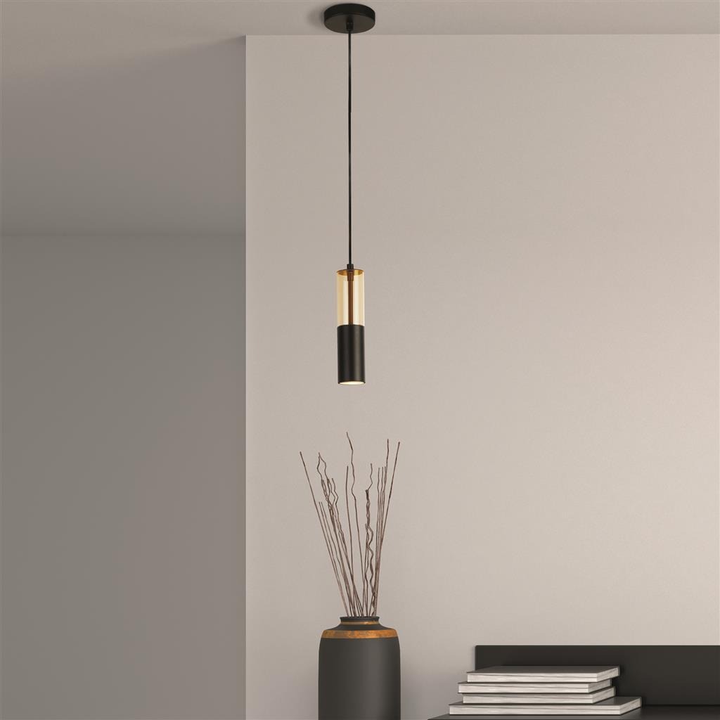 Een moderne hanglamp uit de Merrygold collectie van het merk Searchlight. De zwartkleurige lamp heeft amberkleurig glas en is gemaakt van staal en acryl. Goed toepasbaar in verschillende interieuren daar de lamp een minimalistische uitstraling heeft. Stijlvol boven de eettafel of hang meerdere naast elkaar boven het keukeneiland. De lamp wordt geleverd exclusief lichtbron met GU10 fitting geschikt voor max. 35W. De Merrygold kan bij installatie in hoogte worden versteld naar wens.