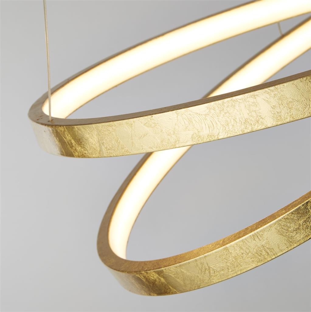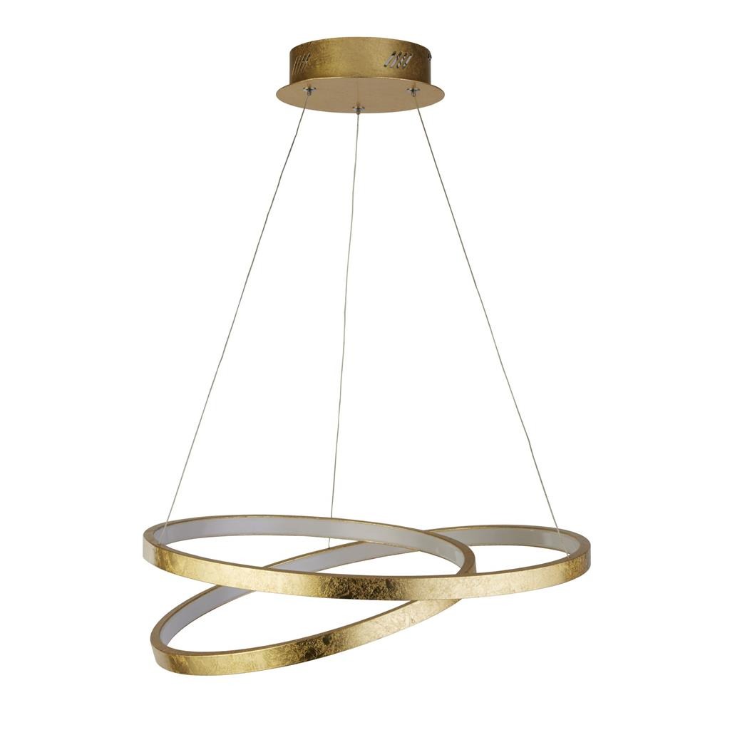 Een opvallende hanglamp uit de Float collectie van het merk Searchlight. De goudkleurige lamp is gemaakt van staal, aluminium en polycarbonaat. De gouden kleur komt van het bladgoud verwerkt op het design. Mooi boven de eettafel of in een ruime hal. De lamp wordt geleverd inclusief LED lichtbron van 42,4 watt. De Float is bij installatie in hoogte verstelbaar. Een echte eyecatcher in elk soort interieur.