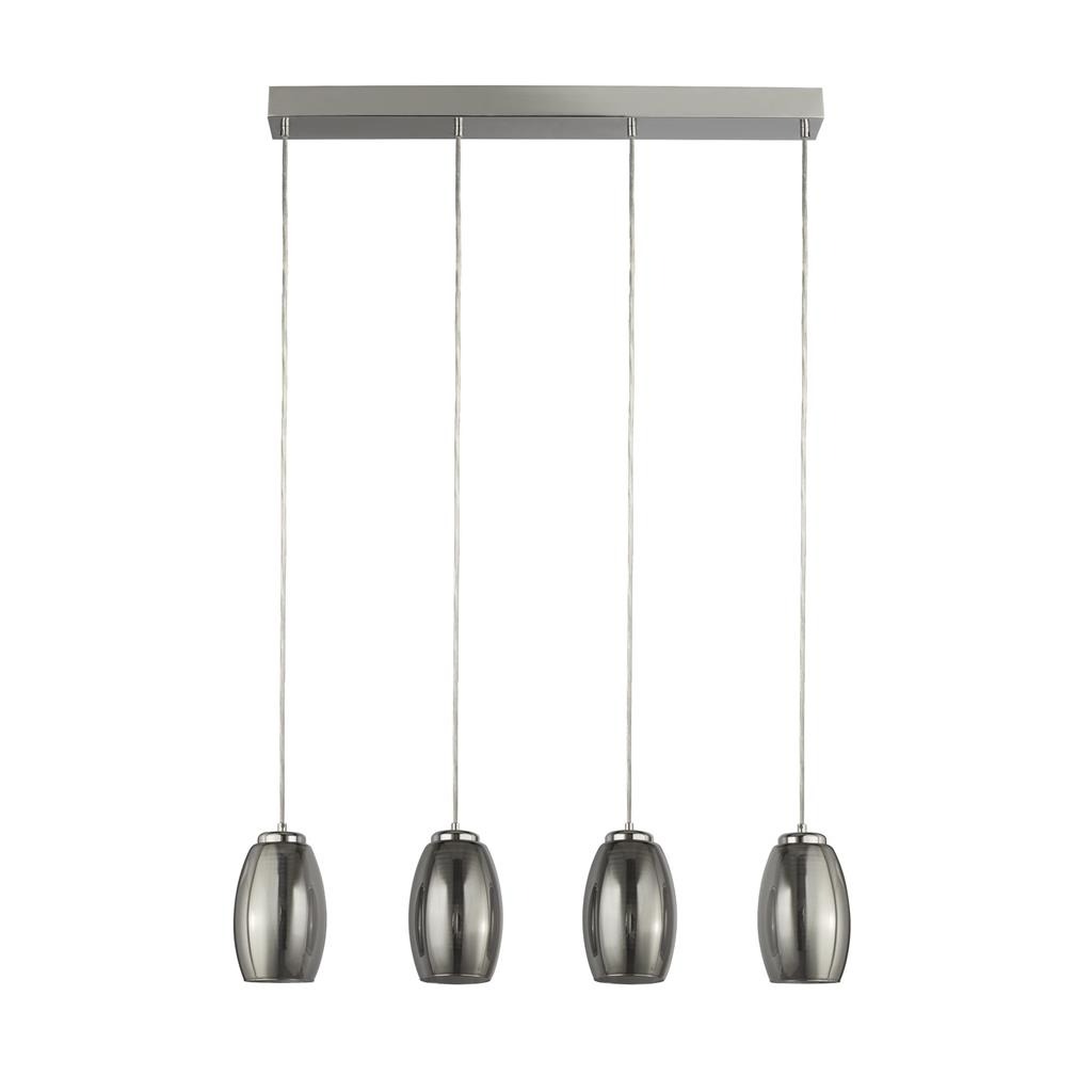 Een 4-lichts hanglamp uit de Cyclone collectie van het merk Searchlight. De lamp is chroom van kleur en heeft 4 rookglas bollen. Goed toepasbaar boven de eettafel. Een blikvanger in elk soort interieur. De lamp wordt geleverd inclusief LED lichtbronnen van 4x 5,5W. De Cyclone is bij installatie in hoogte verstelbaar naar wens.