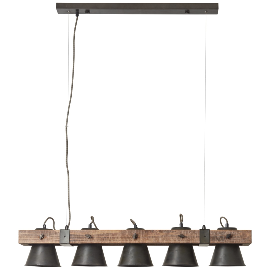 De Decca serie omvat diverse lampen met een stoere, industriële uitstraling die je leuk met elkaar kunt combineren.  Deze hanglamp heeft vijf mooie zwarte stalen kapjes gemonteerd op een houten balk met zwarte beugels en details. De kappen kan je kantelen en zo het licht nog wat richting geven. Er zit 5x een E27 fitting in geschikt voor een lichtbron van ieder max. 10W. Door de lengte hangt deze lamp erg mooi boven de eettafel of kookeiland.