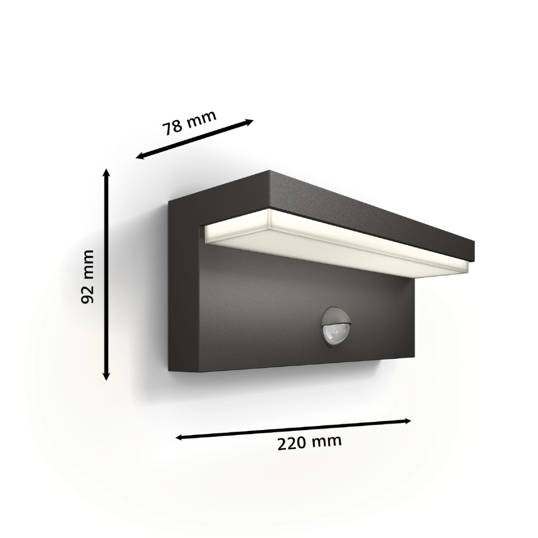 Een moderne wandlamp van Philips uit de outdoor collectie met een antraciet design en handige bewegingssensor. Detecteert de lamp beweging in het gebied, schakelt hij de lamp automatisch in. Dit zorgt voor een veilig gevoel. De lamp heeft warm wit licht af en heeft een zuinige led lichtbron van maar 3,8W, Leuk om te combineren met alle andere lampen uit dezelfde serie. De lamp heeft een IP waarde van 44 en is daarmee bestendig tegen diverse weersomstandigheden.