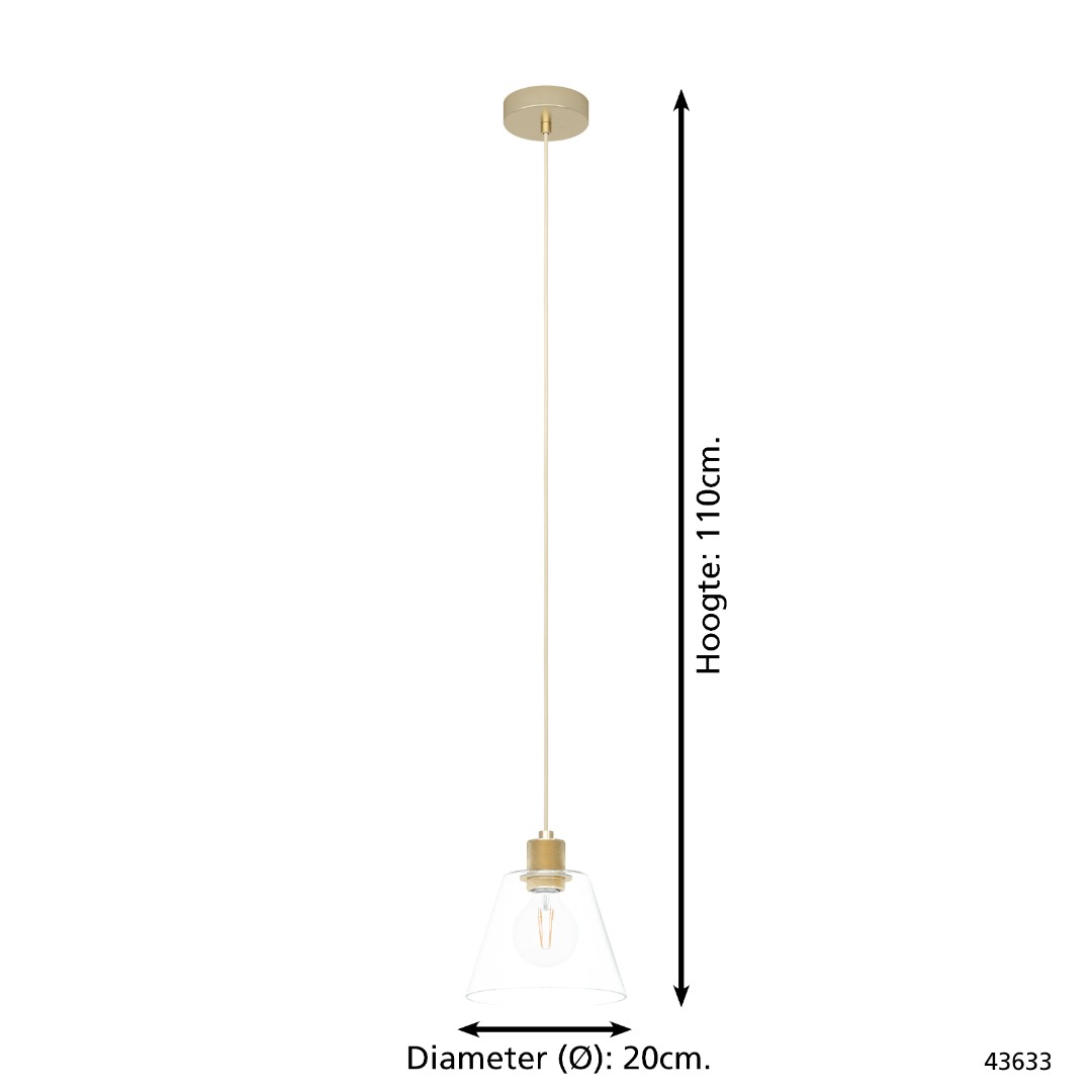 Een mooie hanglamp uit de hanglampen collectie van Eglo. De lamp heeft een retro/vintage achtige look vanwege het doorzichtige glas en de accentkleur goud, gemaakt van staal en aluminium. De lamp wordt exclusief lichtbron geleverd en heeft een E27 fitting geschikt voor max. 40W. Deze lamp staat goed in de eetkamer, bijvoorbeeld boven de eettafel, maar kan ook zeker ergens anders in de woonkamer geplaatst worden.