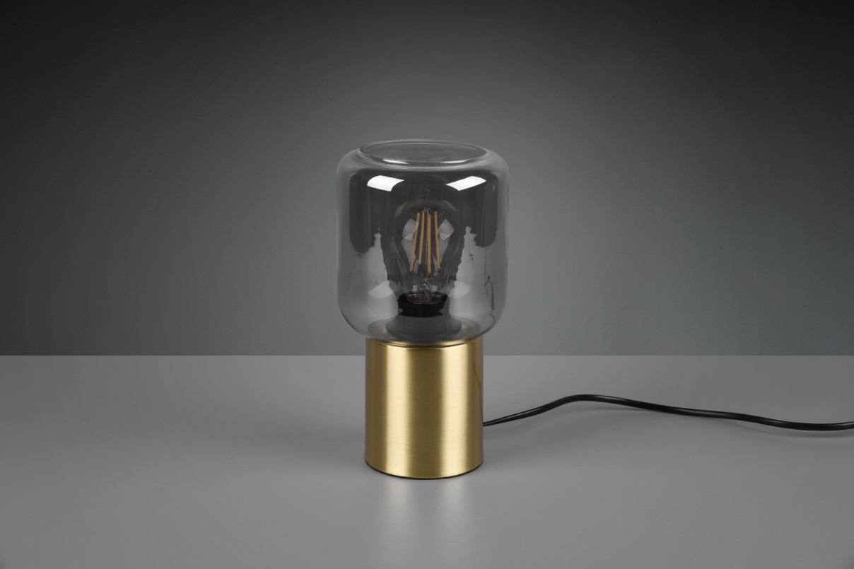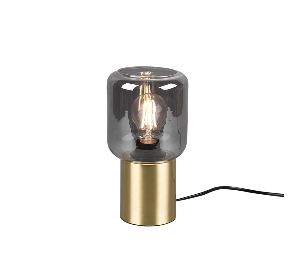 Een sfeervolle tafellamp van het Duitse verlichtingsmerk Trio. De lampenvoet is gemaakt van metaal in de kleur messing mat. De rookkleurige glazen kap heeft een diameter van 13 cm en biedt plaats aan één E27-fitting die niet is inbegrepen, maar die afzonderlijk bijbesteld kan worden. Te denken valt bijvoorbeeld aan een mooie goudkleurige filament lamp. Let daarbij op dat het maximale vermogen van 40W niet overschreden wordt. Dit tafellampje kan goed worden geplaatst op een kast of bijzettafel in de woonkamer of hal bijvoorbeeld. Met deze lamp krijgt het interieur gelijk een knusse upgrade. De lamp beschikt over een snoerschakelaar op een snoer met een lengte van anderhalve meter.