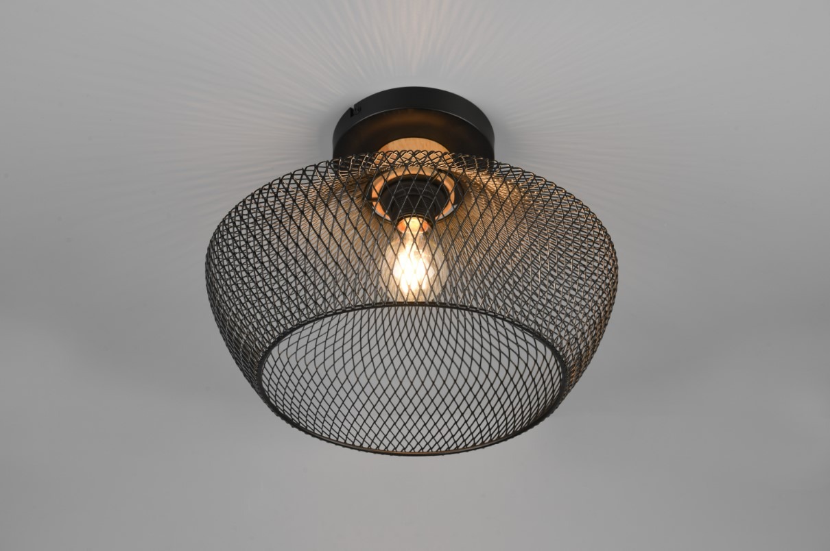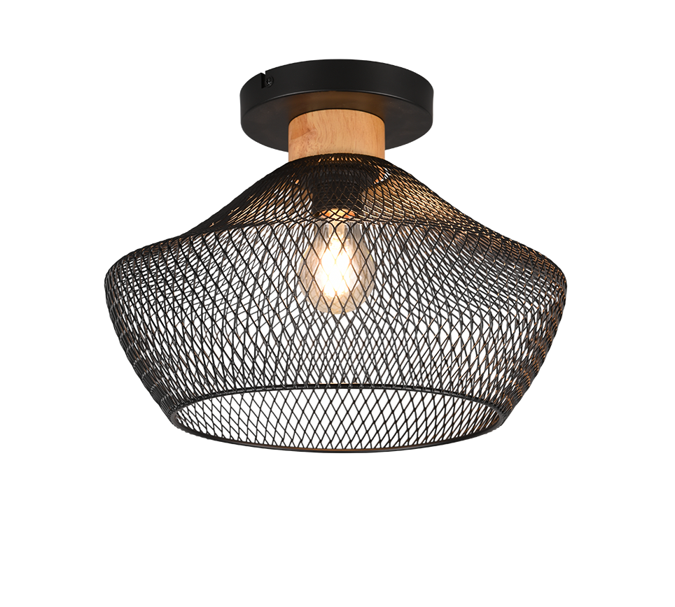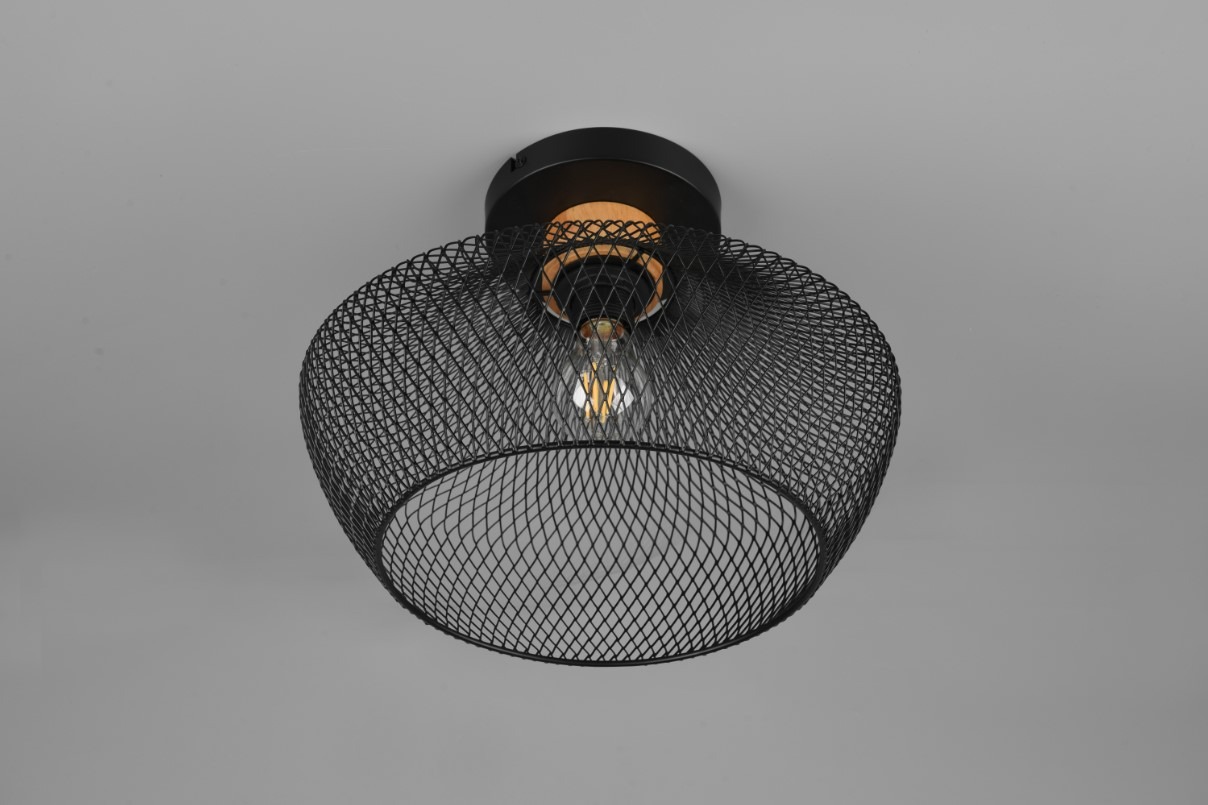 Een plafondlamp uit de nieuwe RL-collectie. Deze armatuur is gemaakt van mat zwart metaal. De kap bestaat uit gaas en heeft een accent van natuurlijk ogend materiaal. De kap biedt plaats aan een E27-fitting. De plafonnière wordt exclusief lichtbron geleverd. Omdat de lamp achter het gaas goed zichtbaar is, raden wij een (goudkleurige) filament lamp aan. De lichtbron mag het maximale wattage van 40W niet overschrijden. Het gaas zorgt voor een uniek lichteffect op plafond en muur.