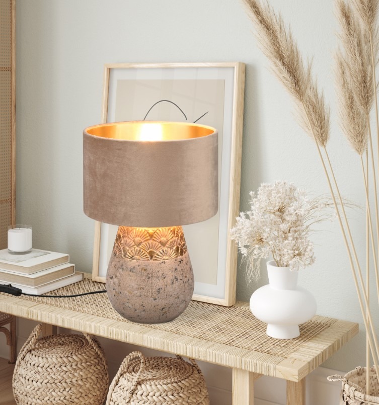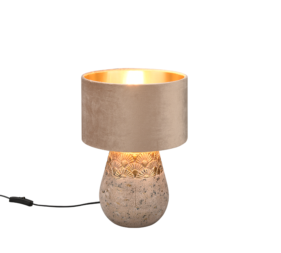 De combinatie van fluweel en keramiek is een garantie voor sfeer. De lampenvoet is gemaakt van keramiek waar een werkje in zit en is uitgevoerd in de kleur grijs. De beige kap welke gemaakt is van velours heeft een diameter van 26 cm. Dit schemerlampje kan goed worden geplaatst op een bureau, kast of bijzettafel, in de woonkamer of hal bijvoorbeeld. De lamp wordt exclusief lichtbron geleverd. U kunt hierdoor zelf bepalen hoeveel licht u wilt hebben. De lamp heeft één E27-fitting die geschikt is voor een max. wattage van 60W en beschikt bovendien over een snoerschakelaar op een snoer met een lengte van anderhalve meter.